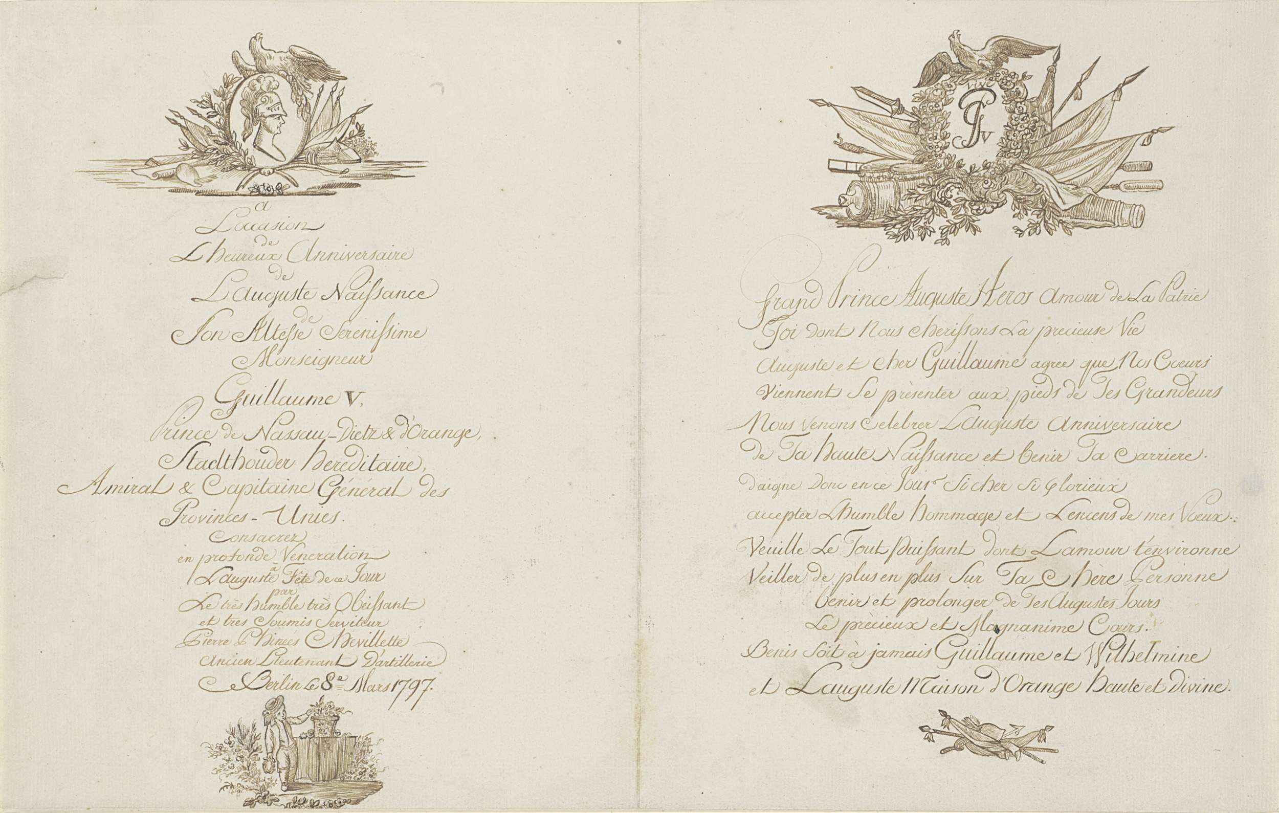 Rechts: Initialen van Willem V in een ovaal van bloemen met daar omheen een aantal allgorische objecten. Linksboven: Een portret in een ovaal met daar omheen een aantal allegorische objecten. Linksonder: Een jongen staat naast een pot met bloemen met in zijn rechterhand een lauwerkrans. Links en rechts een kolom met handgeschreven tekst.