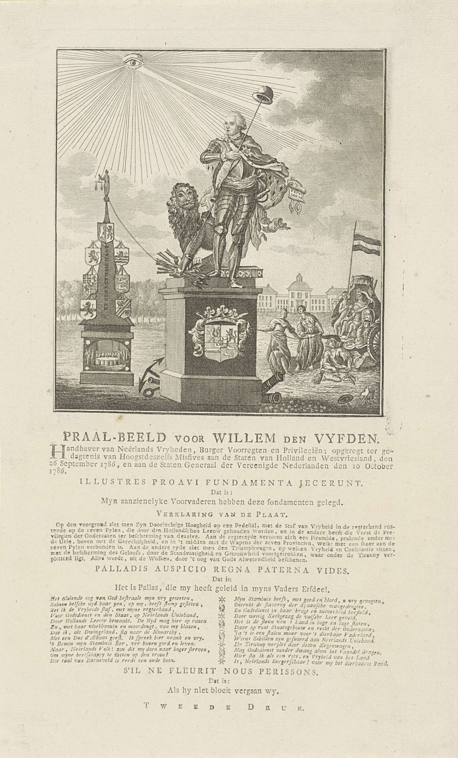 Allegrorisch standbeeld ter ere van Willem V, naar aanleiding van zijn missieven aan de Staten van Holland en West-Friesland van 26 september 1786 en aan de Staten-Generaal van 10 oktober 1786 (Tweede druk). Beeld van de prins in wapenrusting met speer en vrijheidshoed en privileges van het volk, achter hem de Nederlandse Leeuw. Links een ...