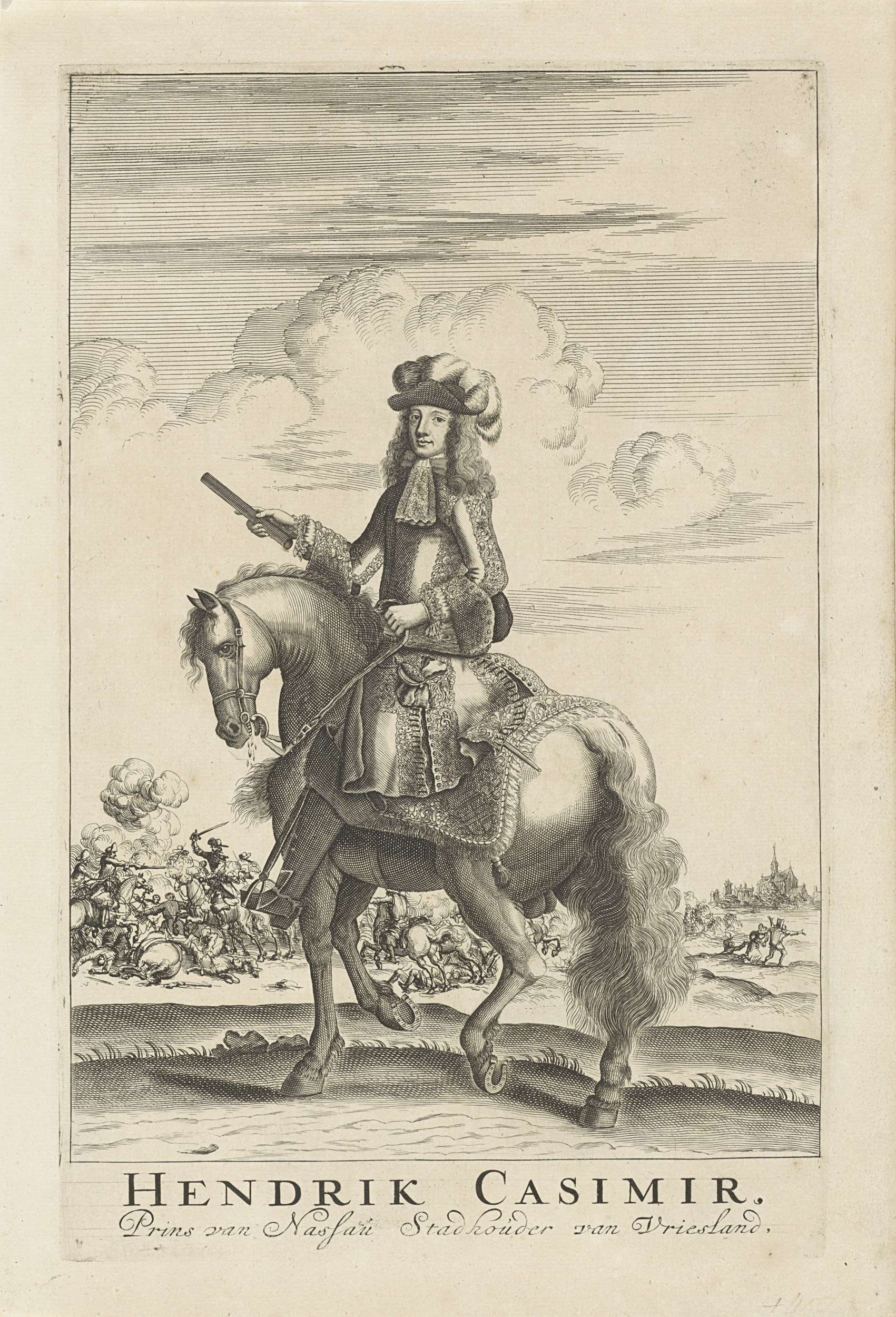 Ruiterportret van Hendrik Casimir II. In zijn rechterhand een commandostaf. Op de achtergrond een ruitergevecht. In de ondermarge zijn naam en titels.