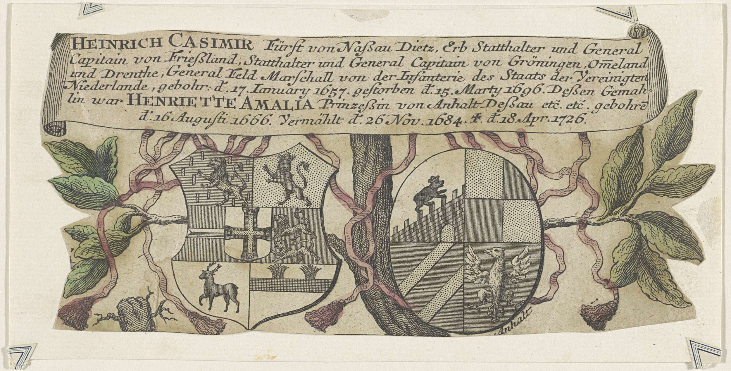 Wapens van Hendrik Casimir II en Henriëtte Amalia van Anhalt-Dessau. In een cartouche zes regels Nederlandse tekst.