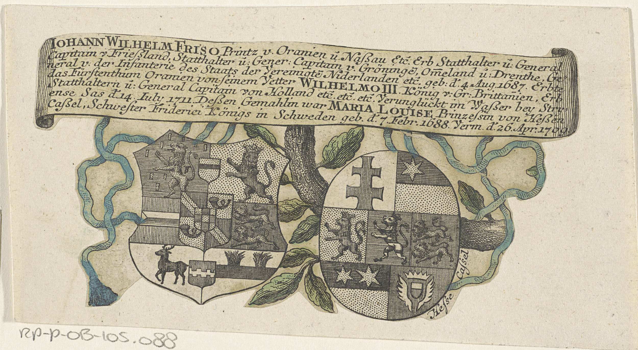 Wapens van Johan Willem Friso, prins van Oranje-Nassau, en Maria Louisa van Hessen-Kassel