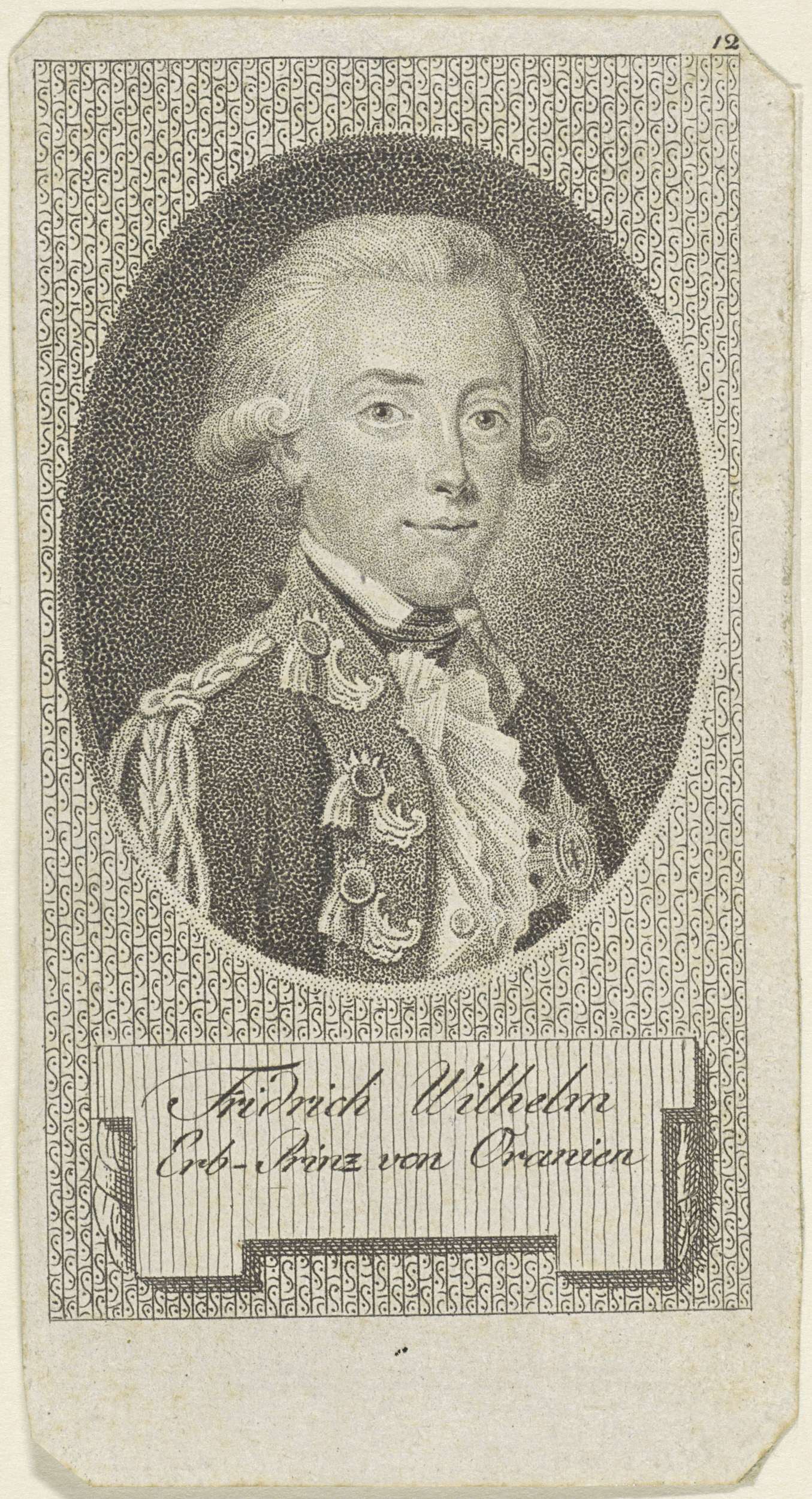 Portret van Willem I Frederik in een ovaal. In een kader zijn naam en titel. Rechtsboven '12'.