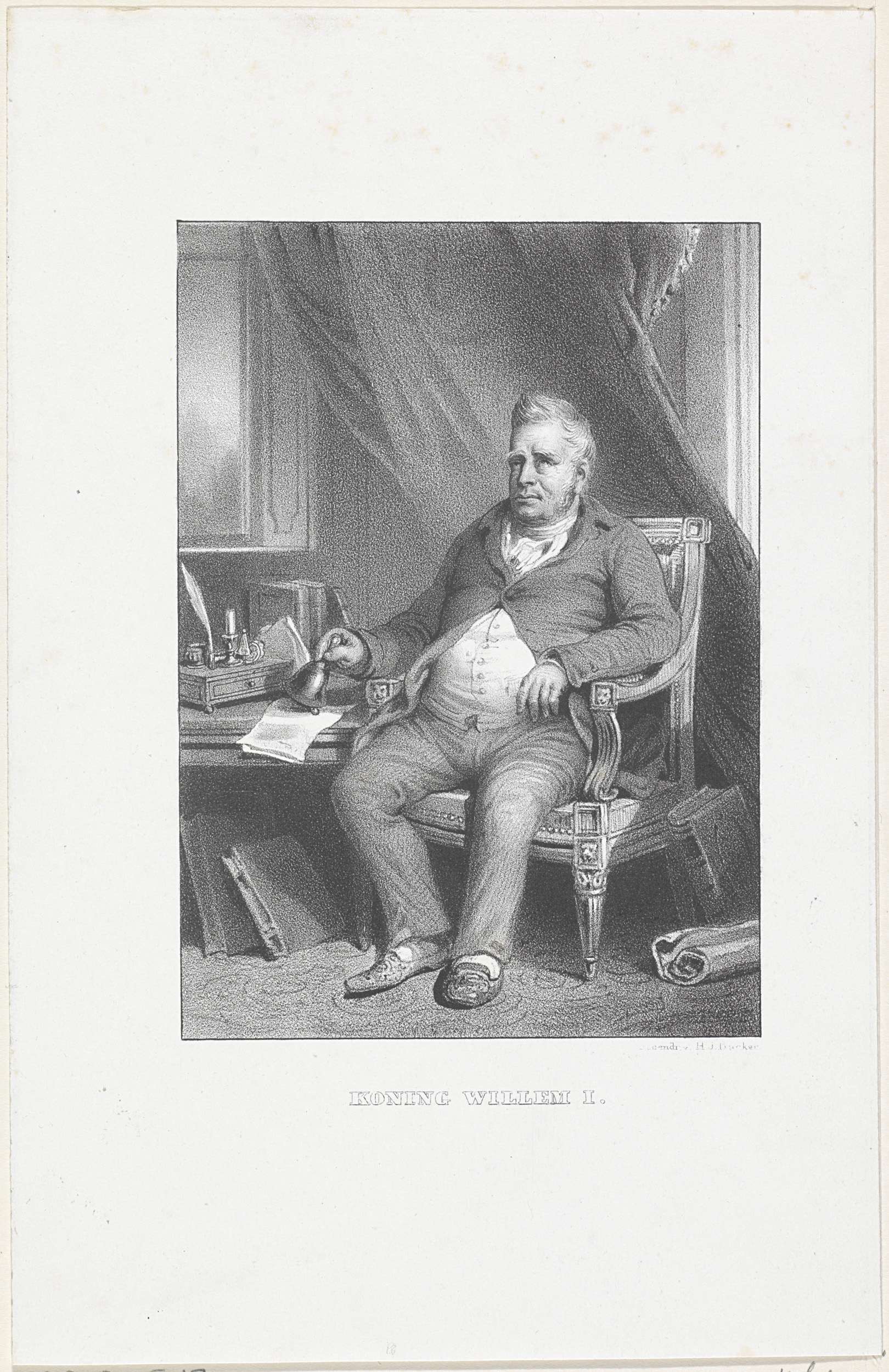 Portret van Willem I Frederik. Hij zit in een vertrek naast een tafel. In zijn rechterhand een bel. In de ondermarge zijn naam en titel.