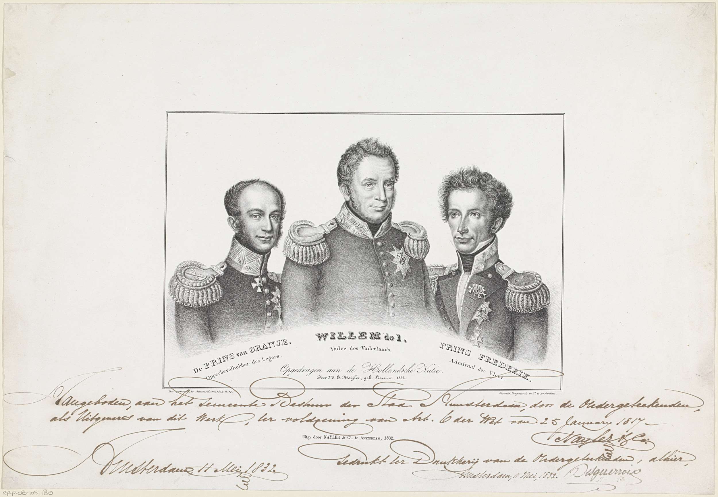 Portret van Willem II, Willem I Frederik en Frederik. In de ondermarge hun namen en titels.