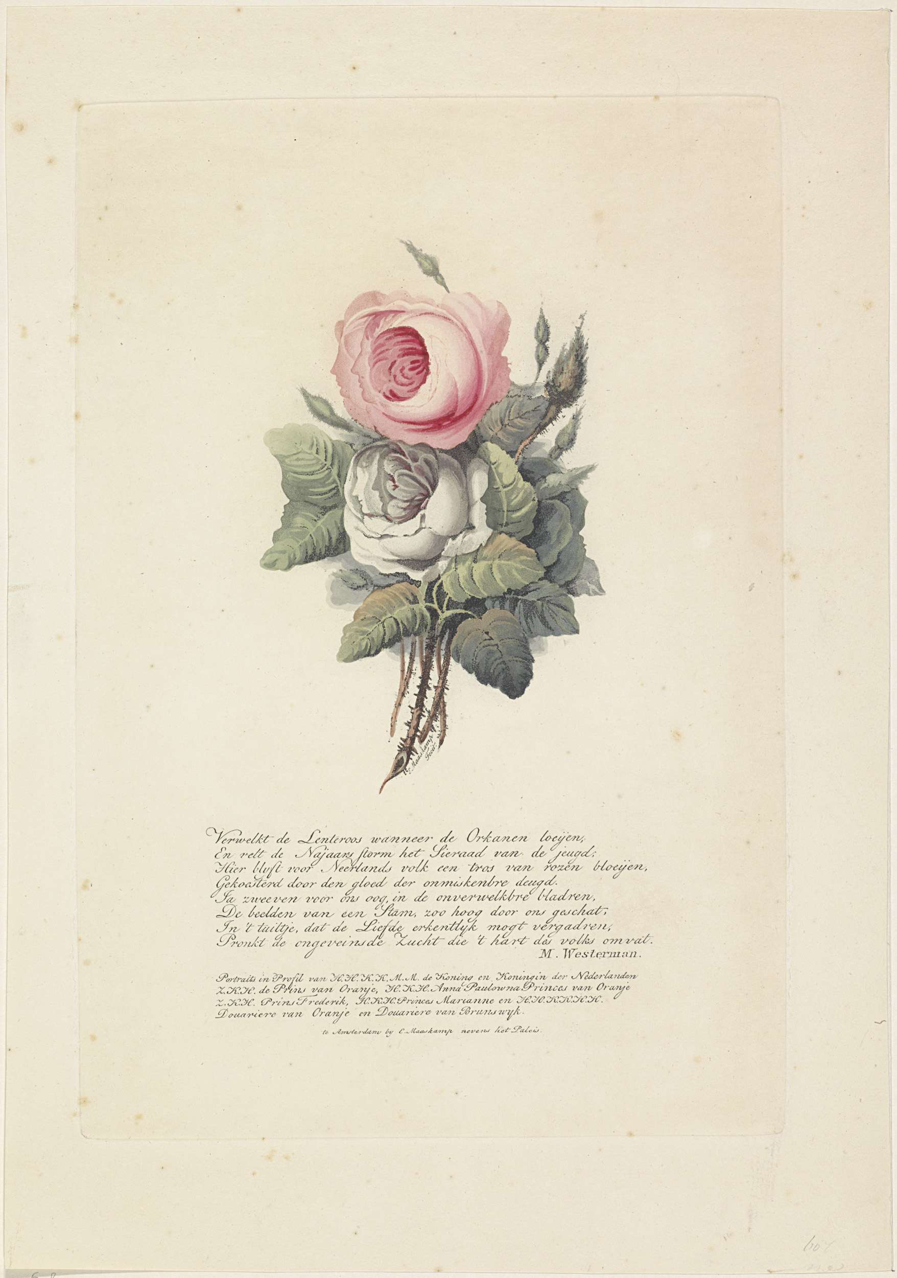 Rozen met tussen de bladeren silhouetportretten van Willem I Frederik, Wilhelmina, hun zoon Willem II met echtgenote Anna Paulowna, hun kinderen Frederik en Marianne, zijn moeder Wilhelmina en zijn zus Louise verstopt. In de ondermarge twaalf regels Nederlandse tekst. Losse verklarende tekst in boekdruk.