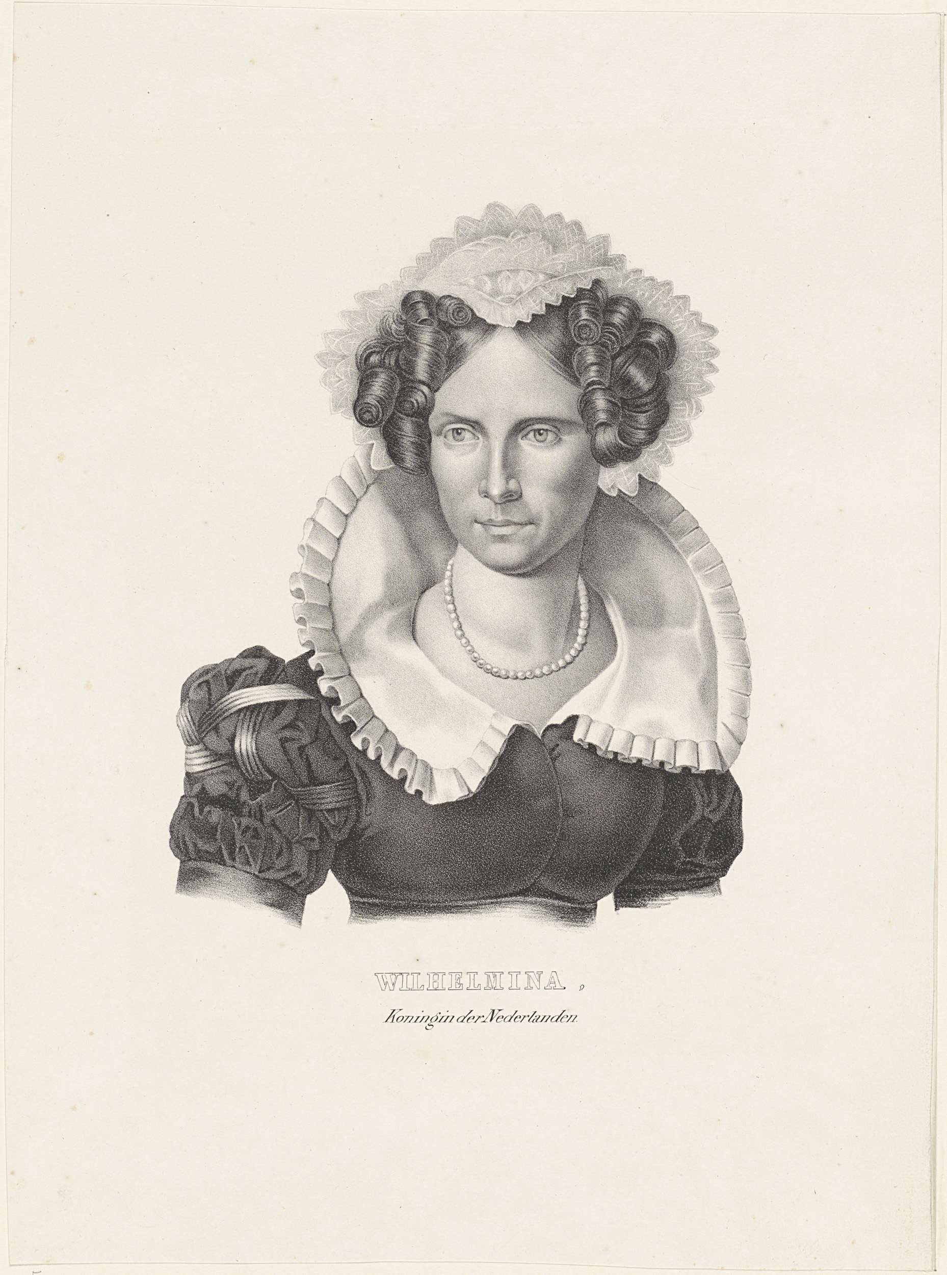 Portret van Wilhelmina. In de ondermarge haar naam en titel.
