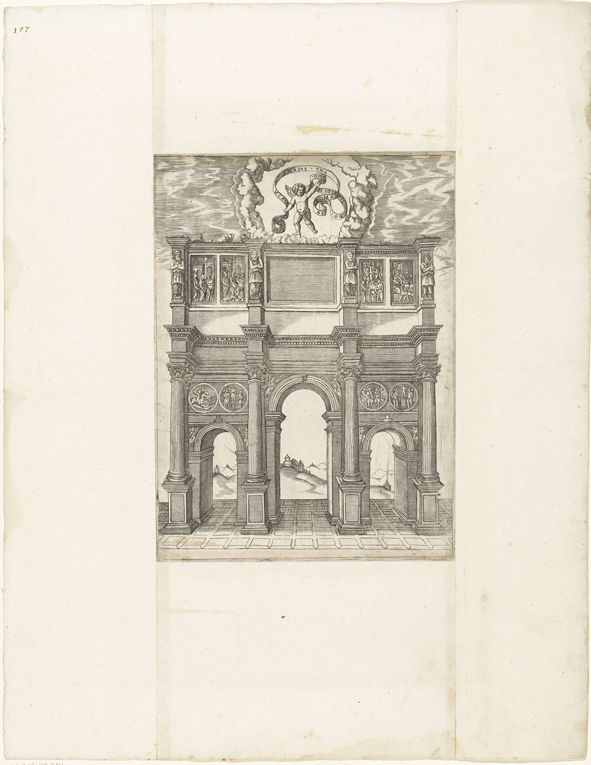 De Boog van Constantijn met daarboven een zwevende putto met een banderol met tekst.