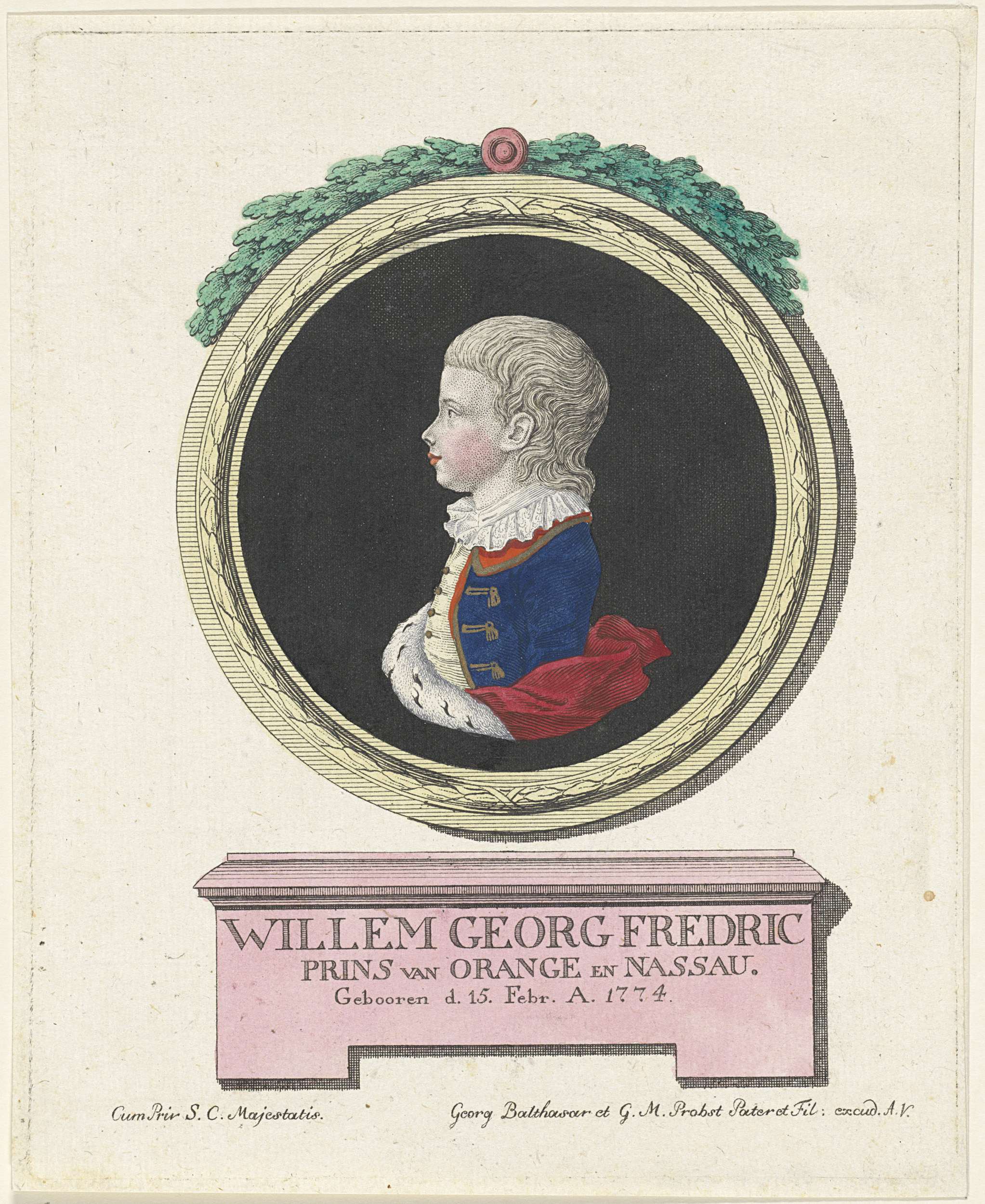 Portret van Frederik in een geornamenteerde cirkel. Op een voetstuk zijn naam, zijn titel en zijn geboortedatum.