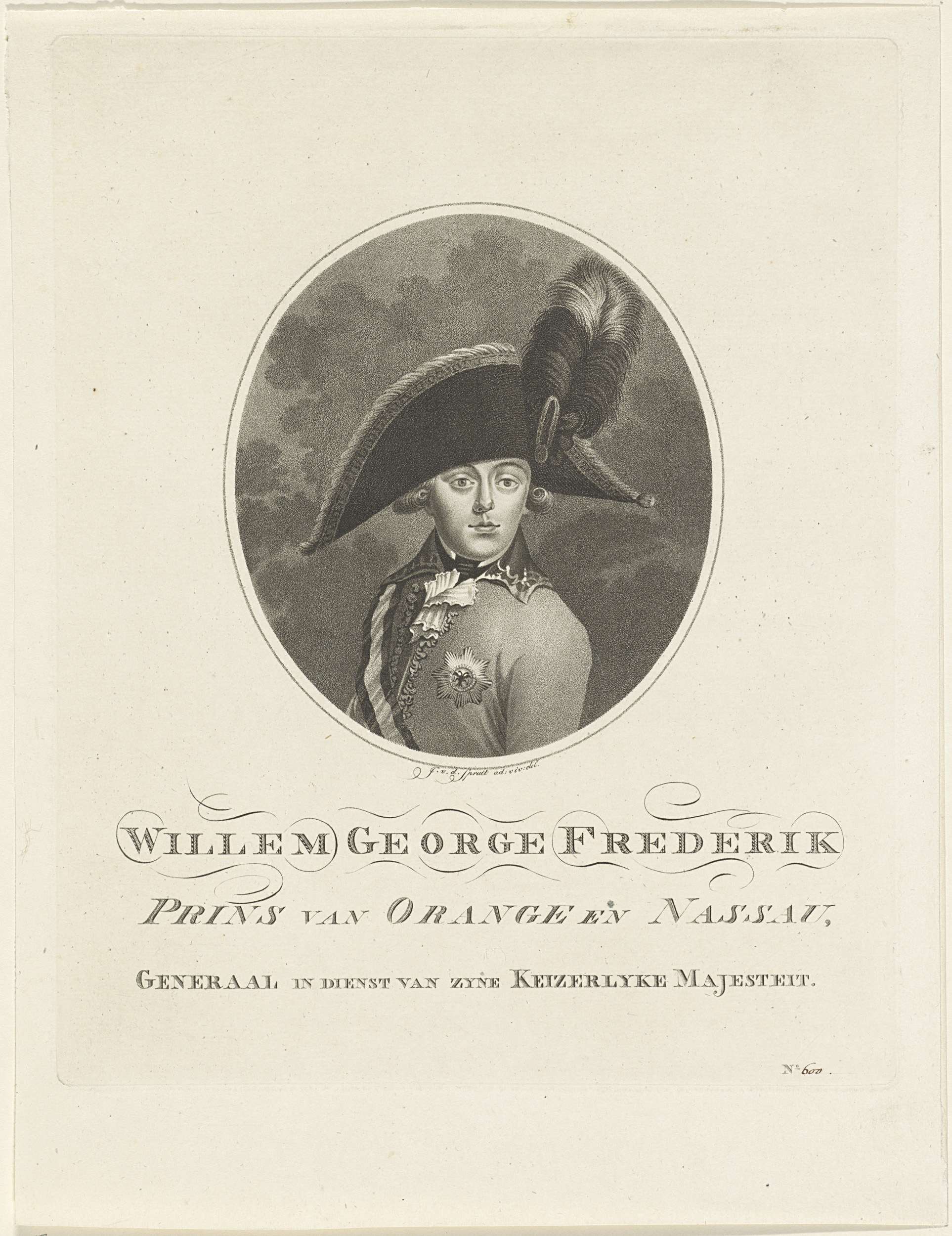 Portret van Frederik met een hoed in een ovaal. In de ondermarge zijn naam en titels.