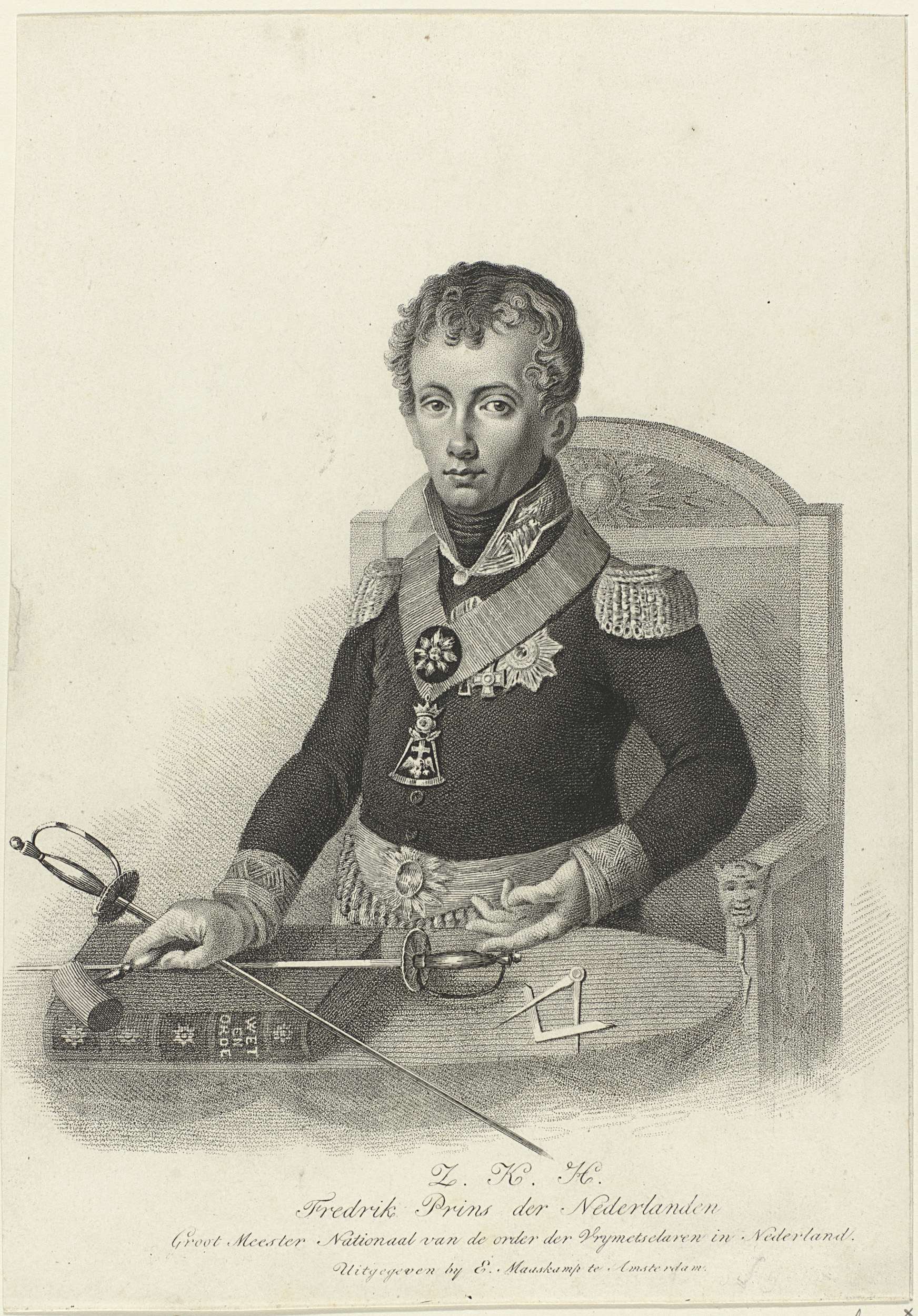 Portret van Frederik als grootmeester der Vrijmetselaren. Hij zit achter een tafel. In zijn rechterhand een hamer. Daaronder ligt een boek met twee gekruiste degens. Daarnaast liggen een passer en een winkelhaak. In de ondermarge zijn naam en titels.