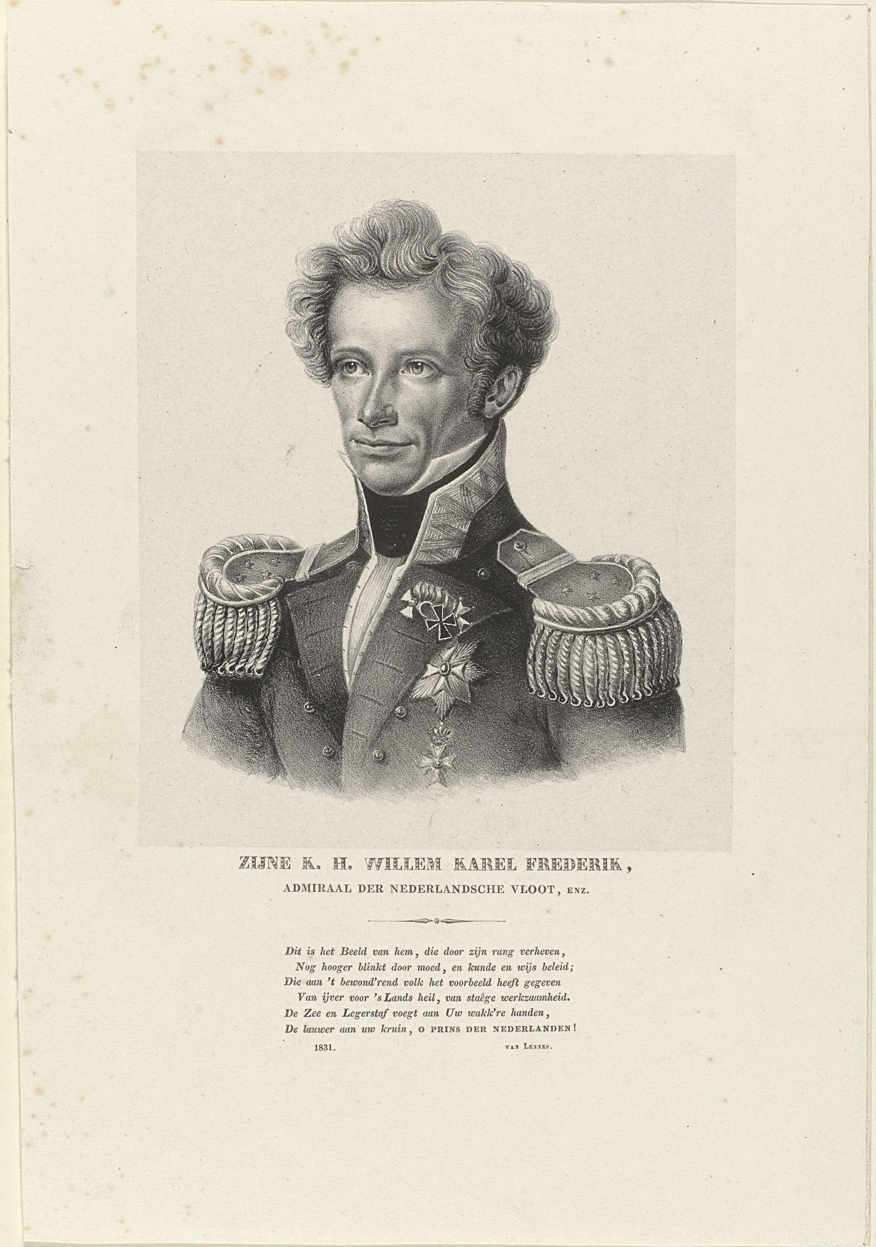Portret van Frederik. Daaronder acht regels Nederlandse tekst in boekdruk.