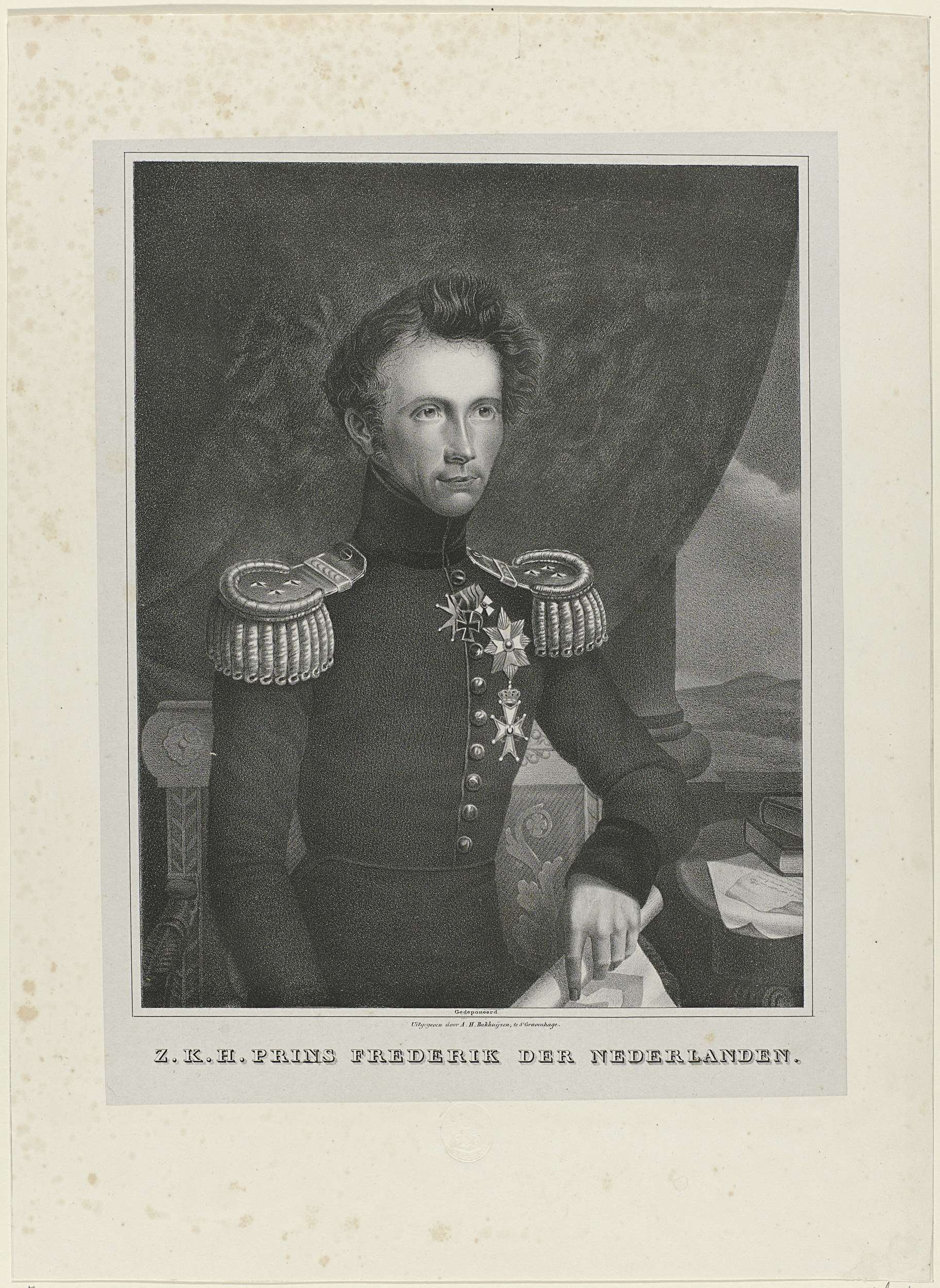 Portret van Frederik. Hij zit naast een tafel met daarop boeken en papieren. In zijn linkerhand een rol. In de ondermarge zijn naam en titel.