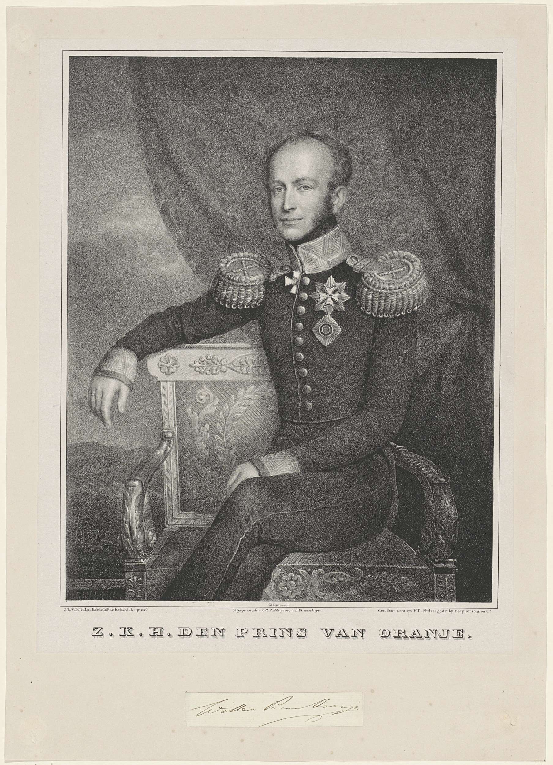 Portret van Willem II in militair uniform (veldmaarschalk). Hij zit in een stoel. In de ondermarge zijn titel. Daaronder losse opgeplakte handtekening met pen.
