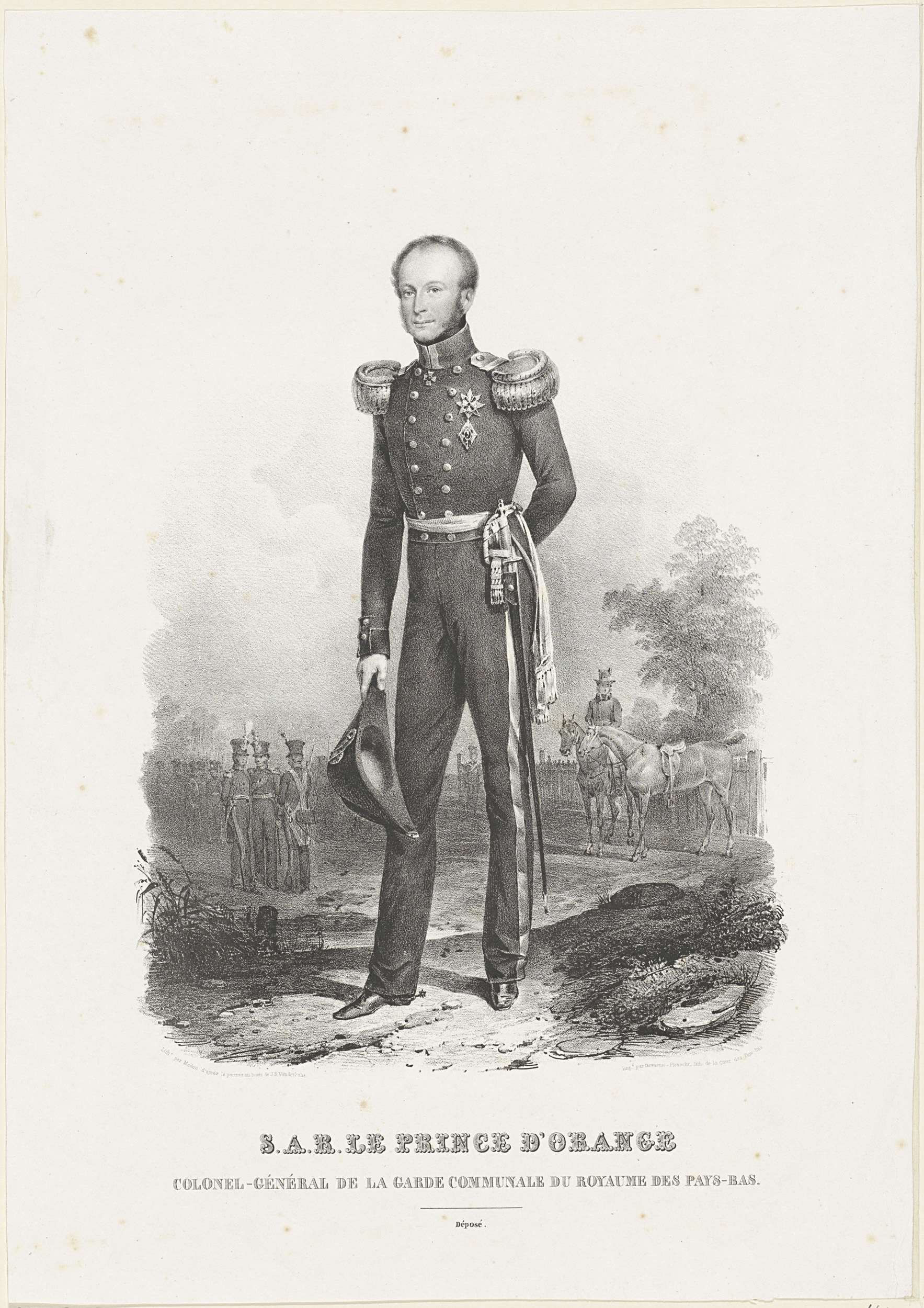 Portret van Willem II. In zijn rechterhand zijn hoed. Op de achtergrond soldaten. In de ondermarge zijn titels.