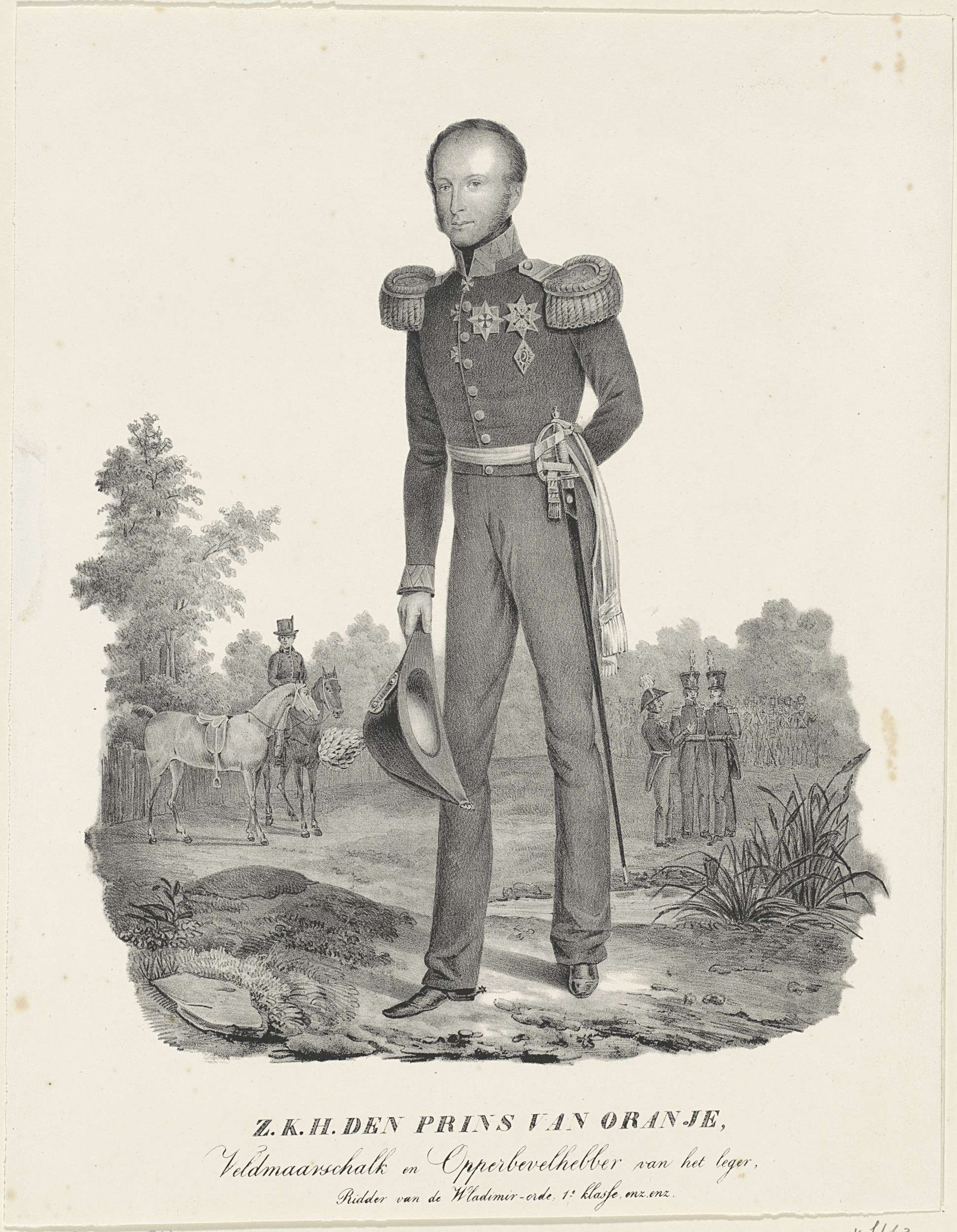 Portret van Willem II. In zijn rechterhand zijn hoed. Op de achtergrond soldaten. In de ondermarge zijn titels.