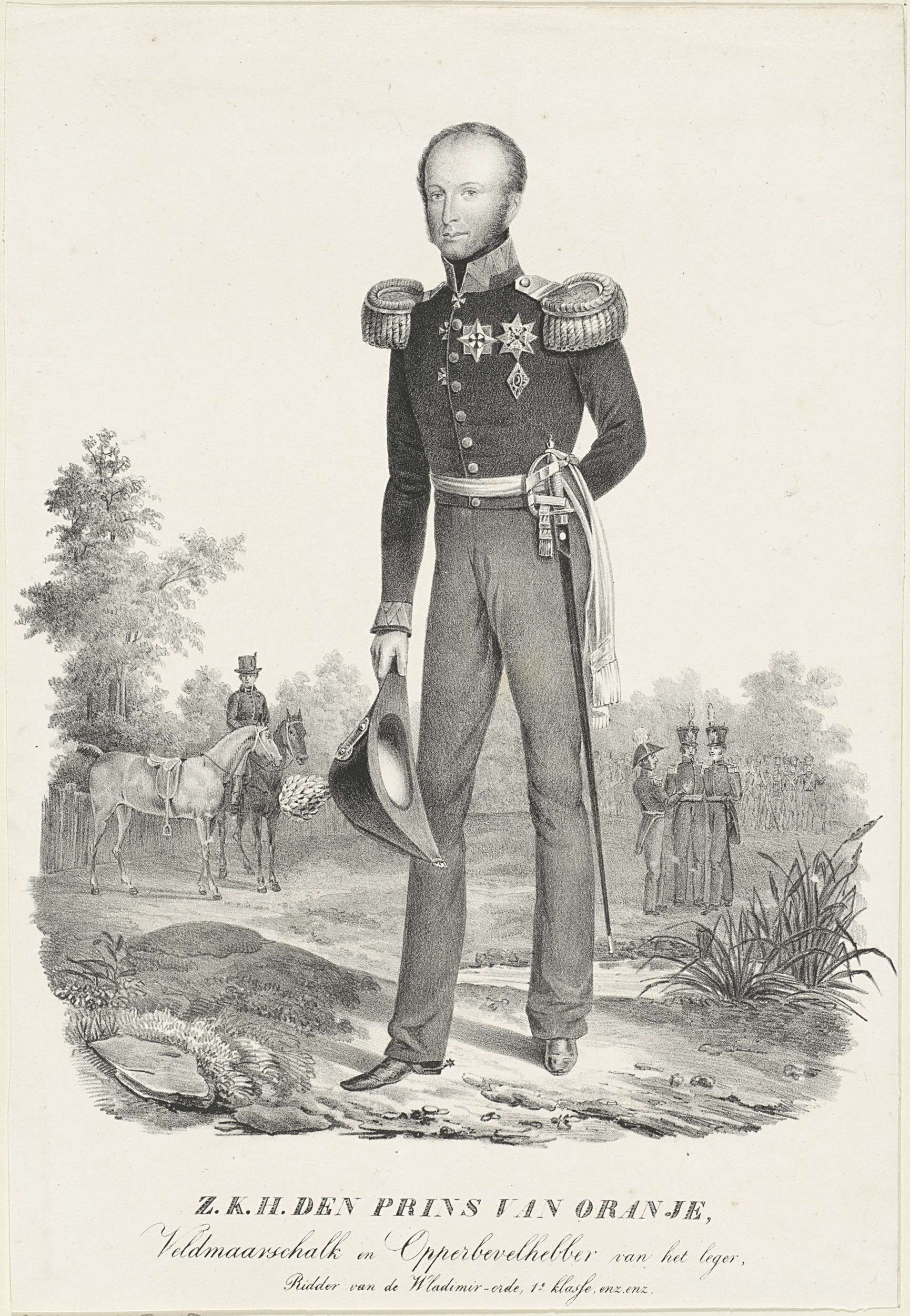 Portret van Willem II. In zijn rechterhand zijn hoed. Op de achtergrond soldaten. In de ondermarge zijn titels.