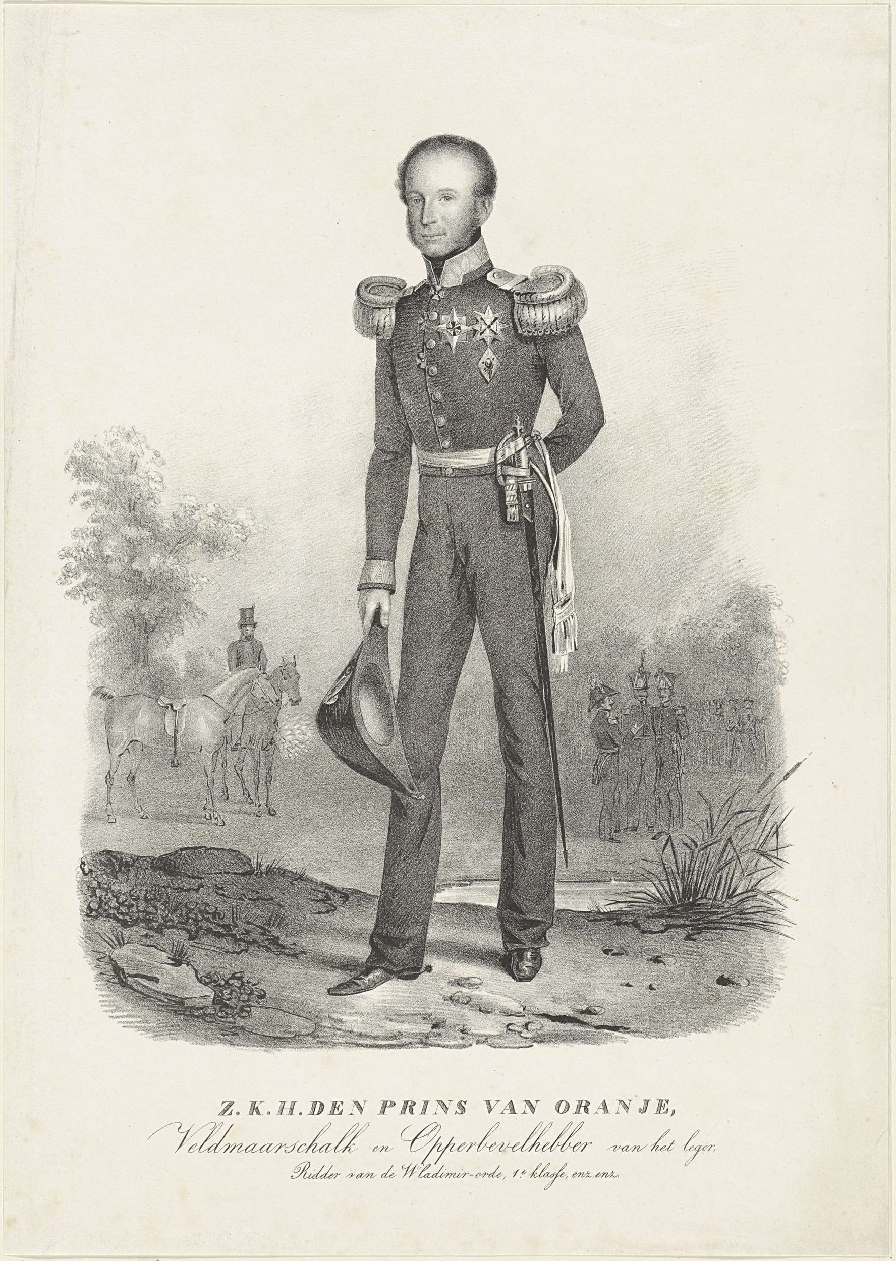 Portret van Willem II. In zijn rechterhand zijn hoed. Op de achtergrond soldaten. In de ondermarge zijn titels.