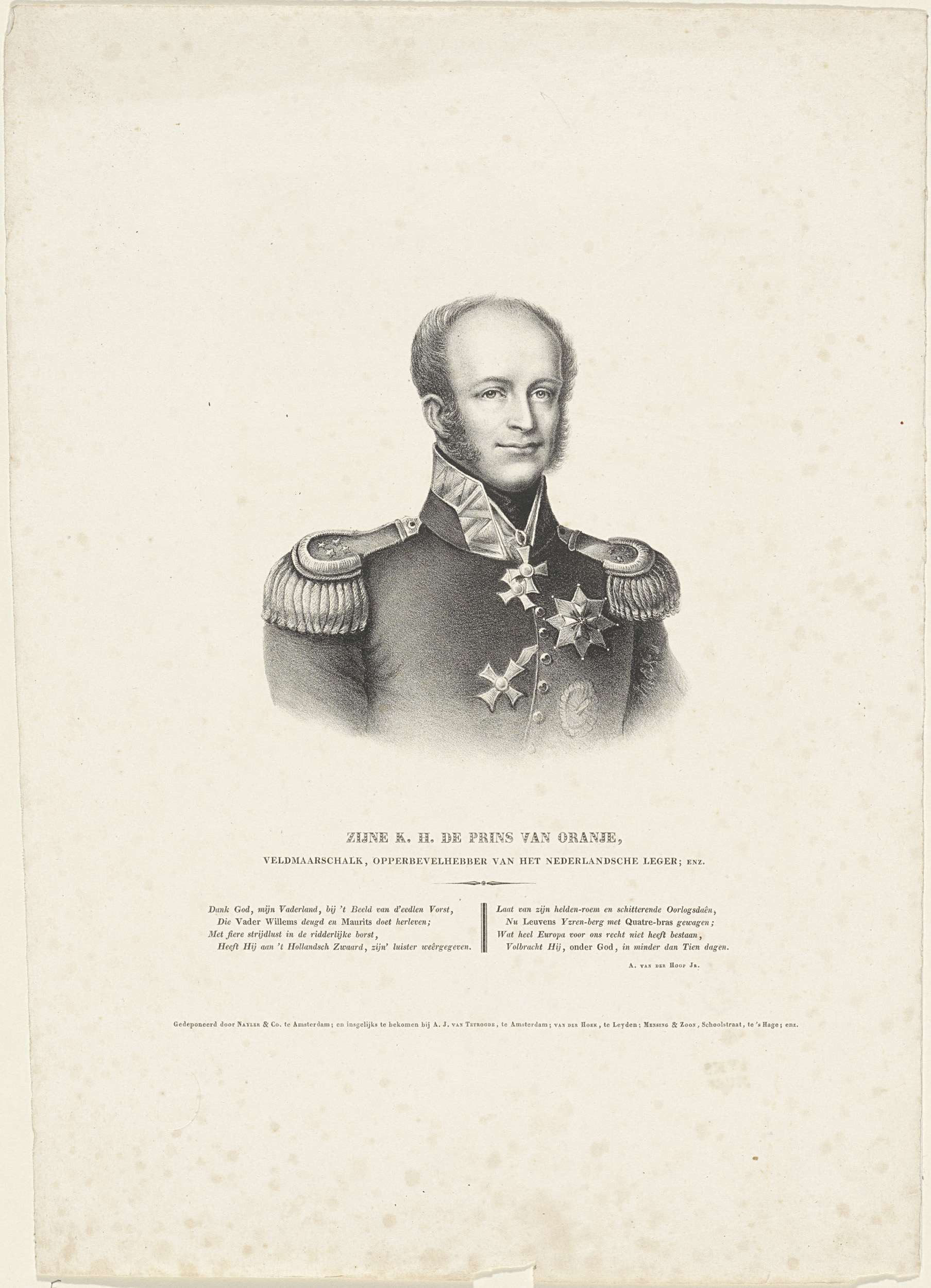 Portret van Willem II. In de ondermarge zijn titel. Daaronder zijn titels en twee kolommen met elk vier regels Nederlandse tekst in boekdruk over de Tiendaagse Veldtocht, van 2 tot 12 augustus 1831.