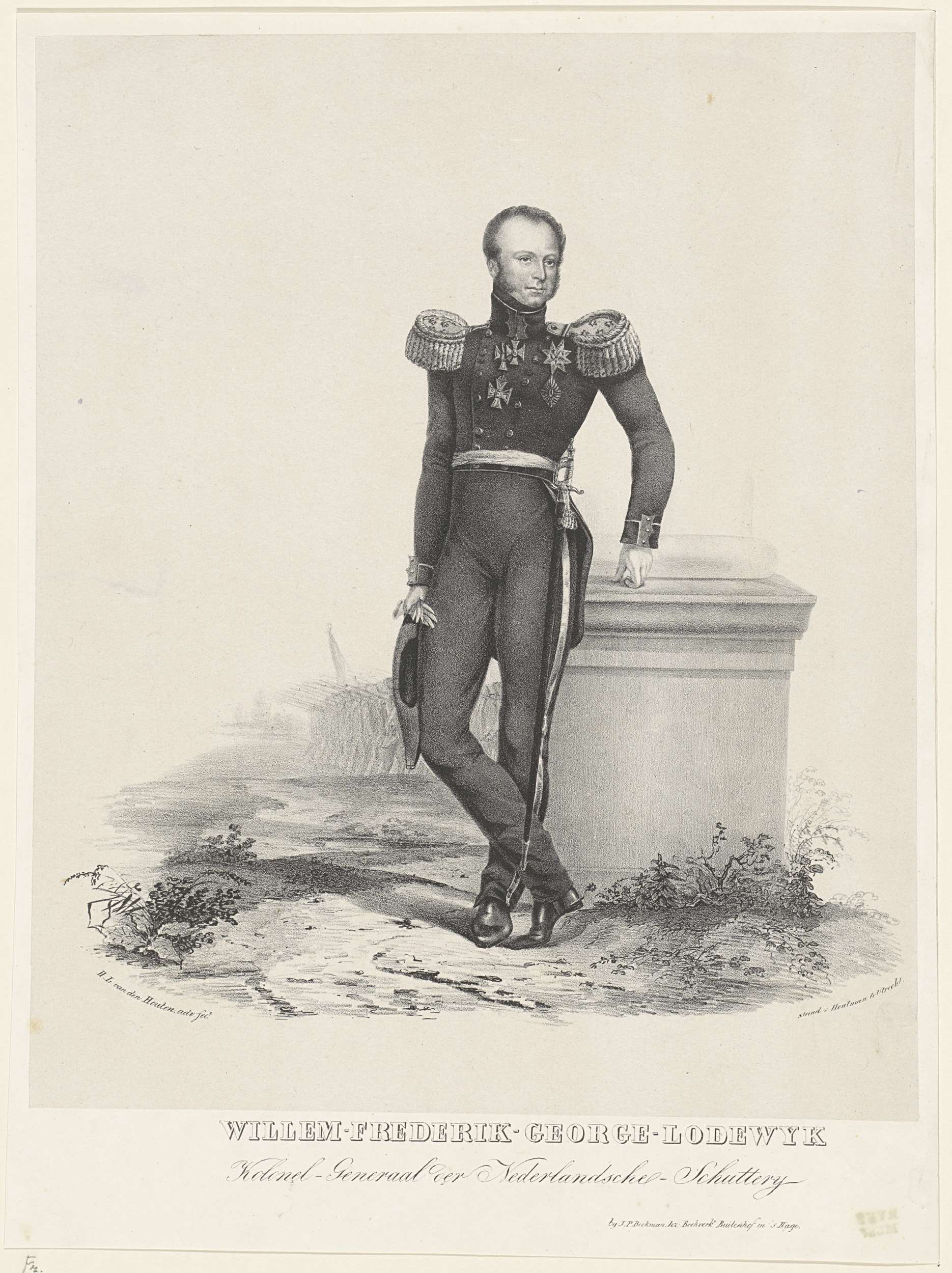 Portret van Willem II. In zijn rechterhand zijn hoed en zijn handschoenen. Op de achtergrond soldaten. In de ondermarge zijn naam en titel.