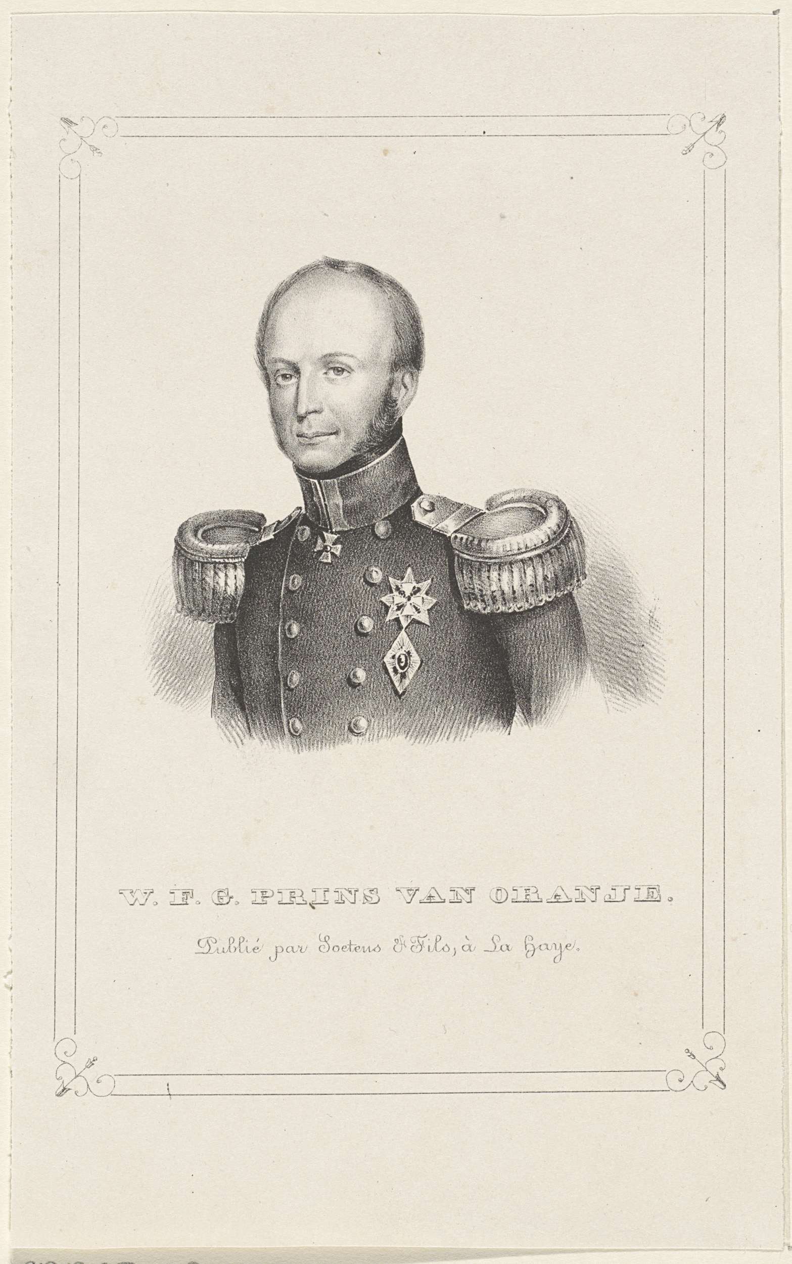 Portret van Willem II in een geornamenteerde rechthoek. In de ondermarge zijn naam en titel.