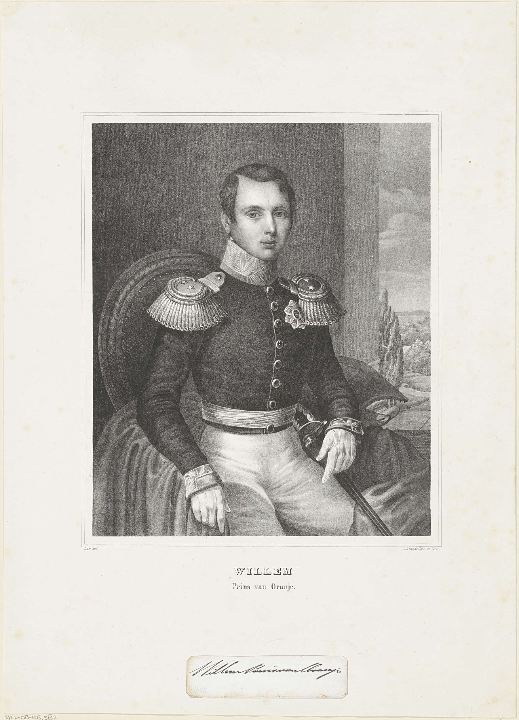 Portret van Willem III. Hij zit in een stoel. Rechts een doorkijkje naar een landschap. In de ondermarge zijn naam en titel. Daaronder losse opgeplakte handtekening met pen.