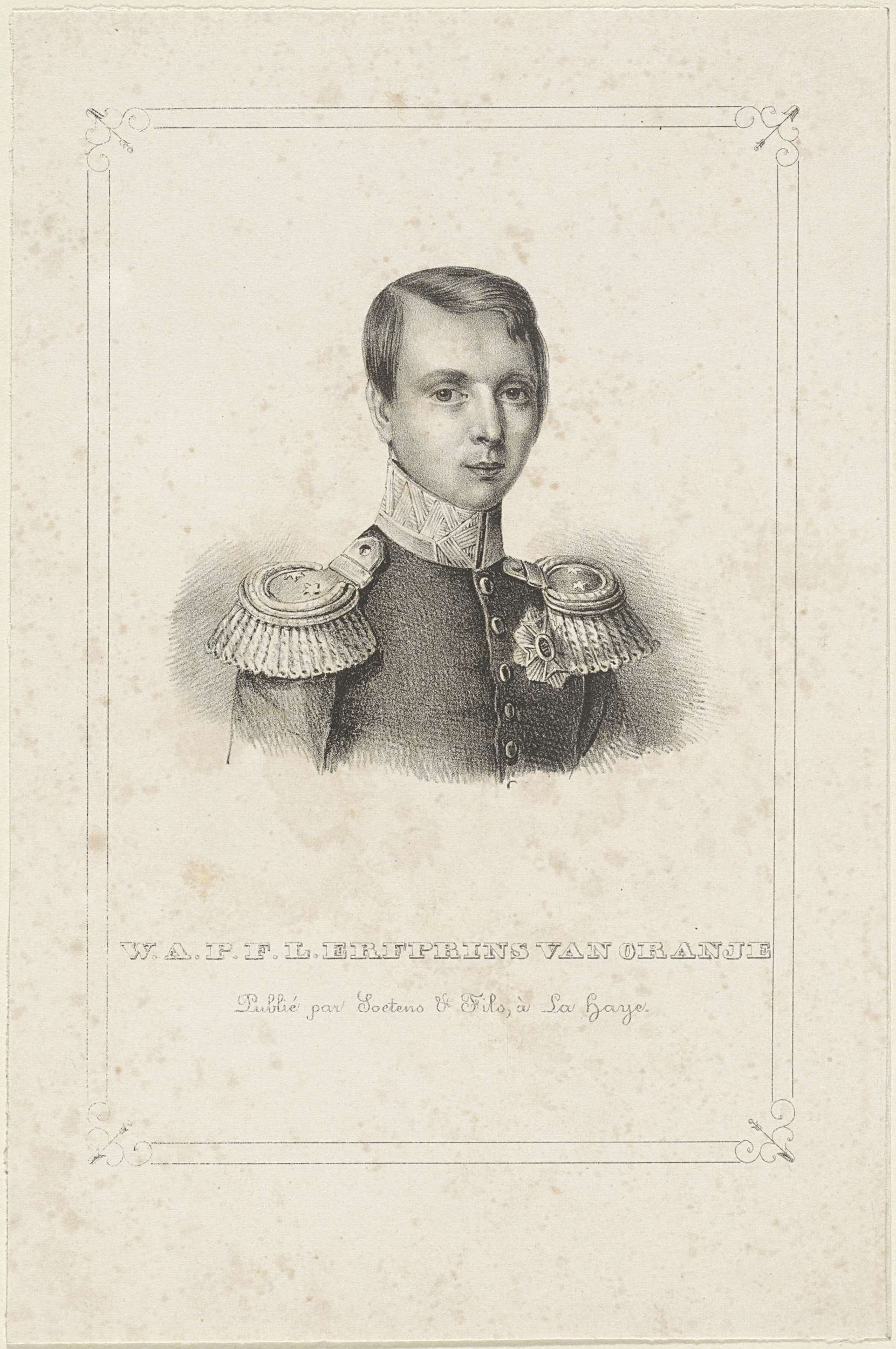 Portret van Willem III in een geornamenteerde rechthoek. In de ondermarge zijn naam en titel.