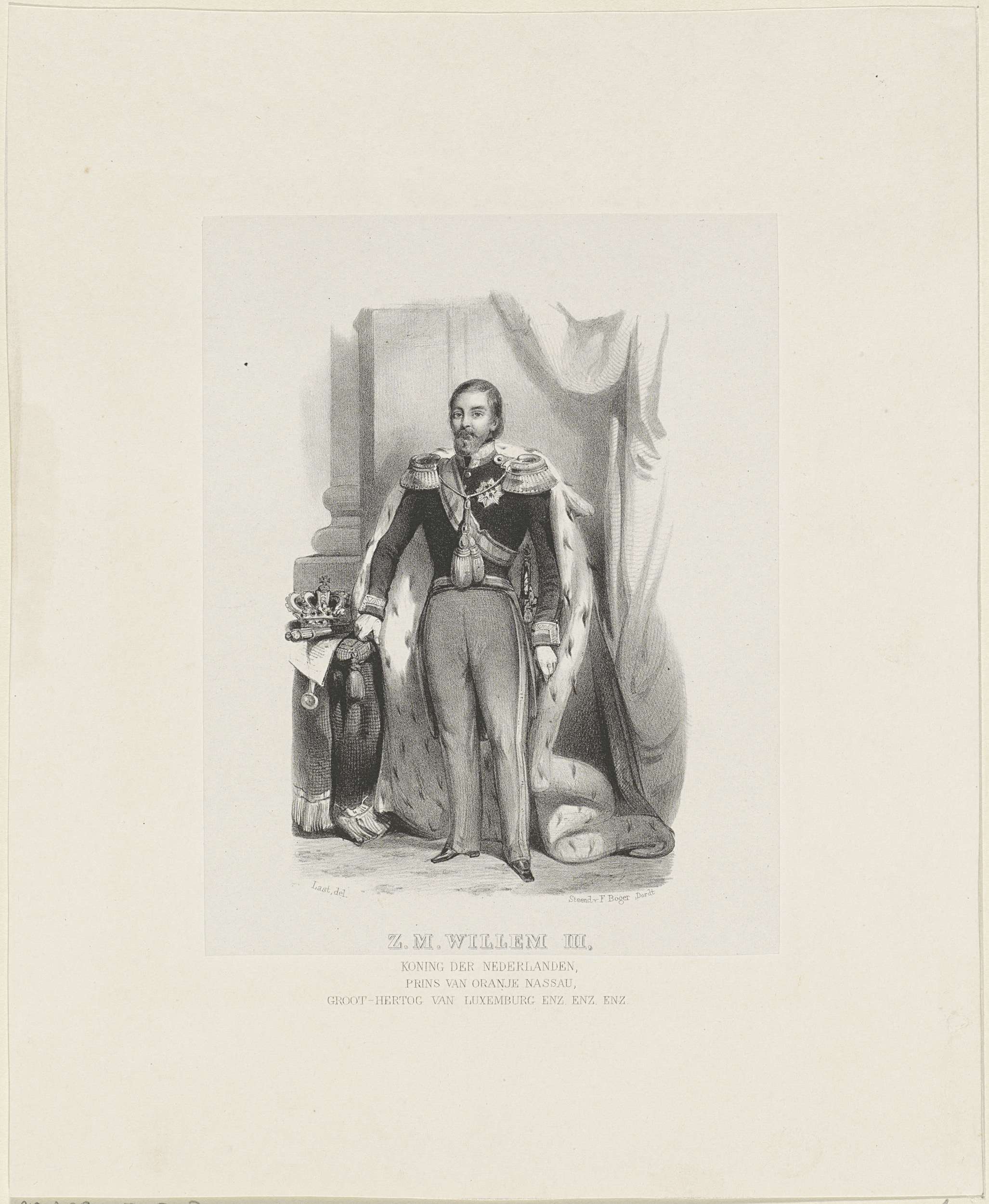 Portret van Willem III met een hermelijnen mantel. Hij staat in een vertrek naast een tafel met daarop een kroon en papieren. In de ondermarge zijn naam en titels.
