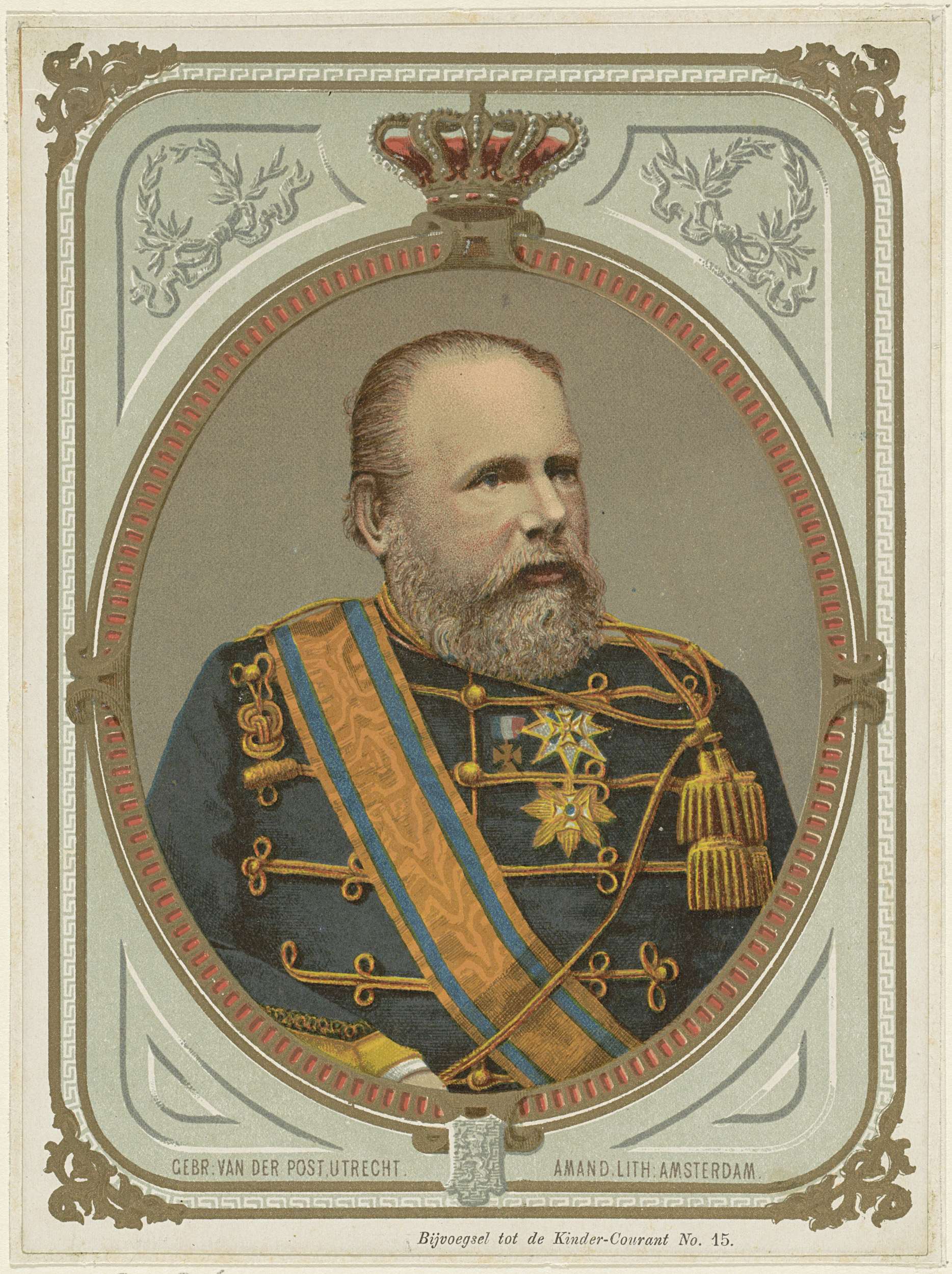 Portret van Willem III in een geornamenteerd ovaal. Midden boven een kroon. Links- en rechtsboven een lauwerkrans met een strik. Geheel in een geornamenteerde rechthoek. Bijvoegsel van de 'Kinder-Courant'.