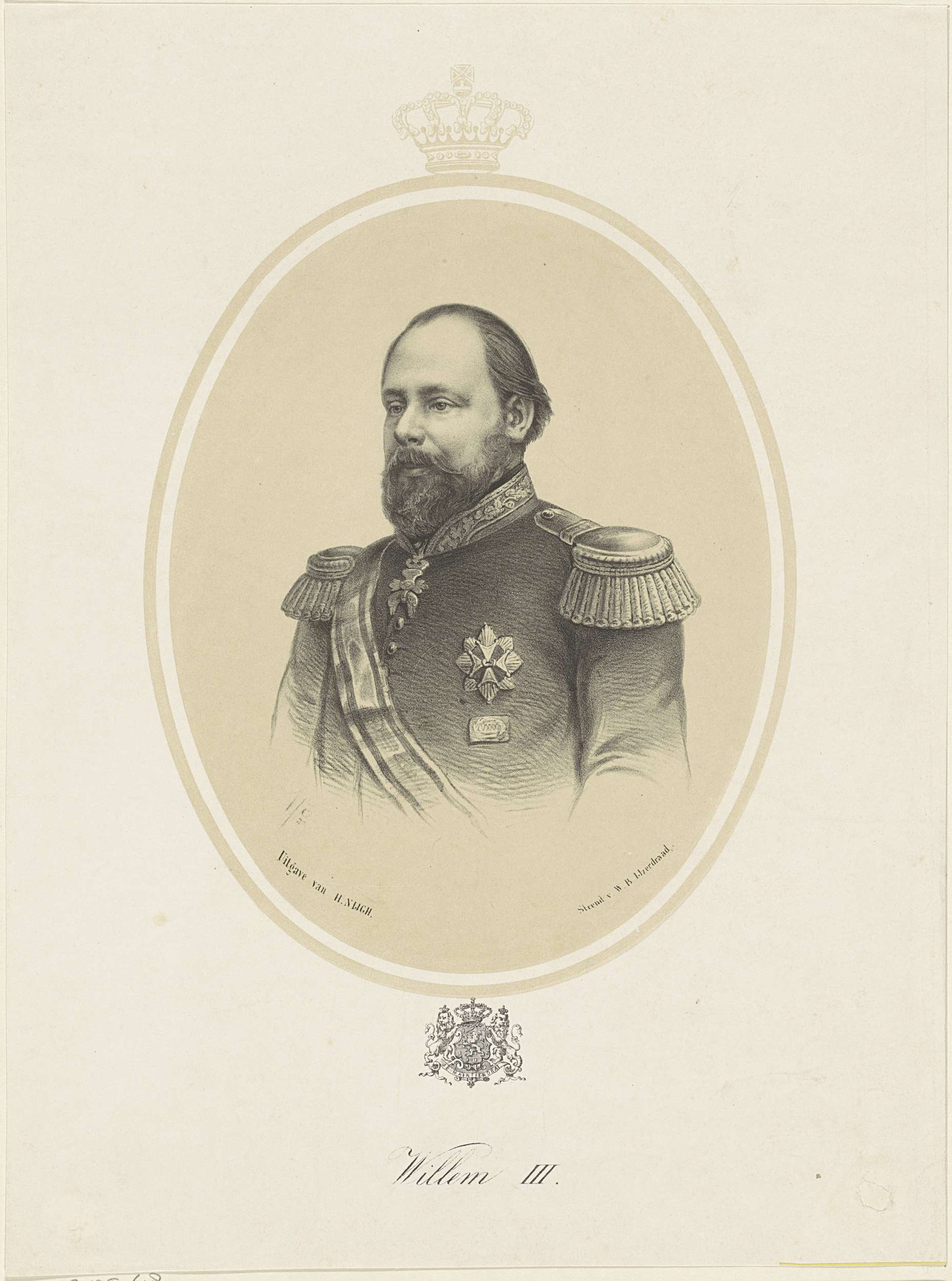 Portret van Willem III in een ovaal. Midden boven een kroon. Midden onder zijn wapen met een kroon en twee leeuwen. Daaronder op een banderol zijn geslachtsspreuk. In de ondermarge zijn naam.
