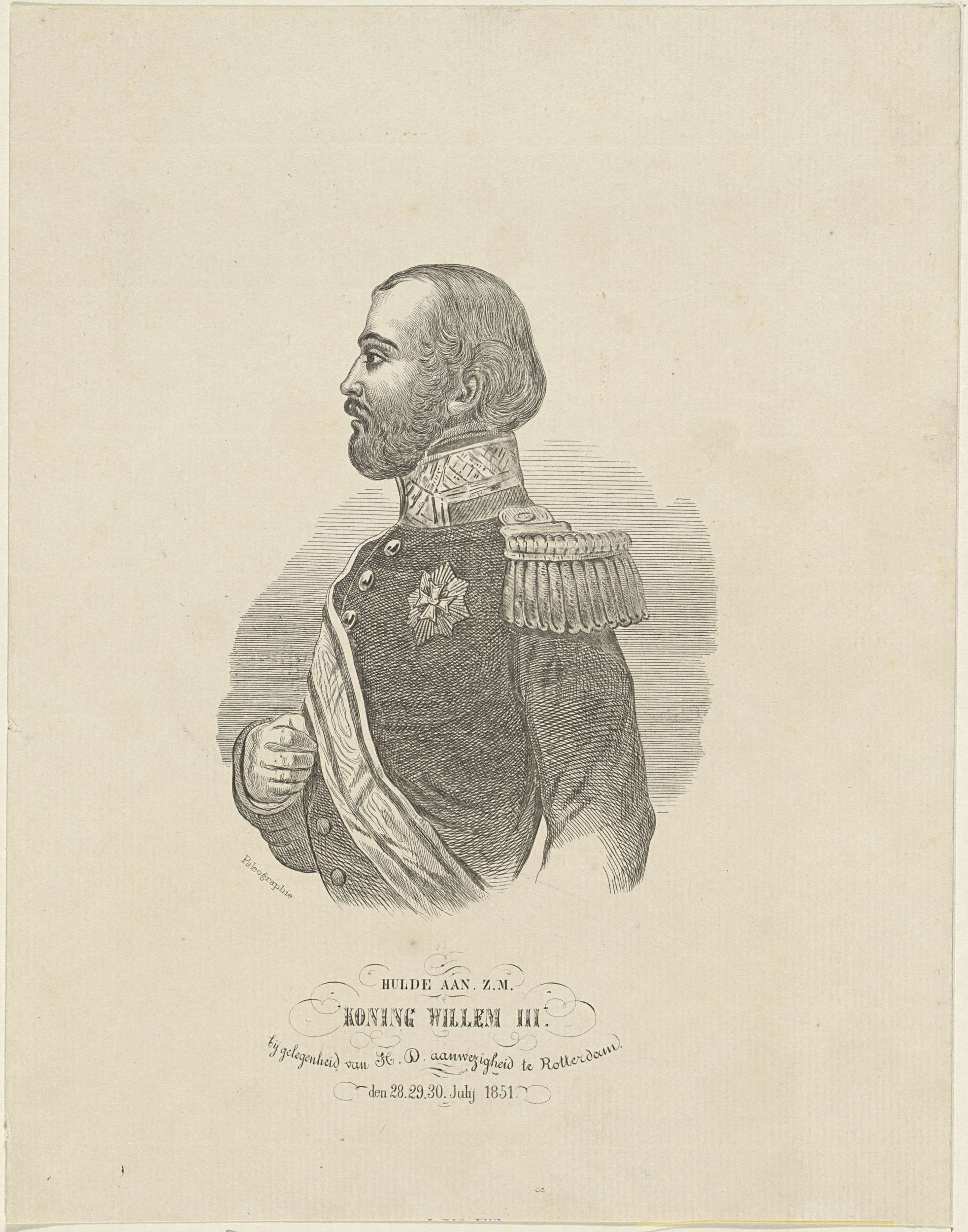 Portret van Willem III. In de ondermarge vier regels Nederlandse tekst. Linksonder 'Paleographie'. Vervaardigd ter gelegenheid van de aanwezigheid van Willem III te Rotterdam op 28, 29 en 39 juli 1851.