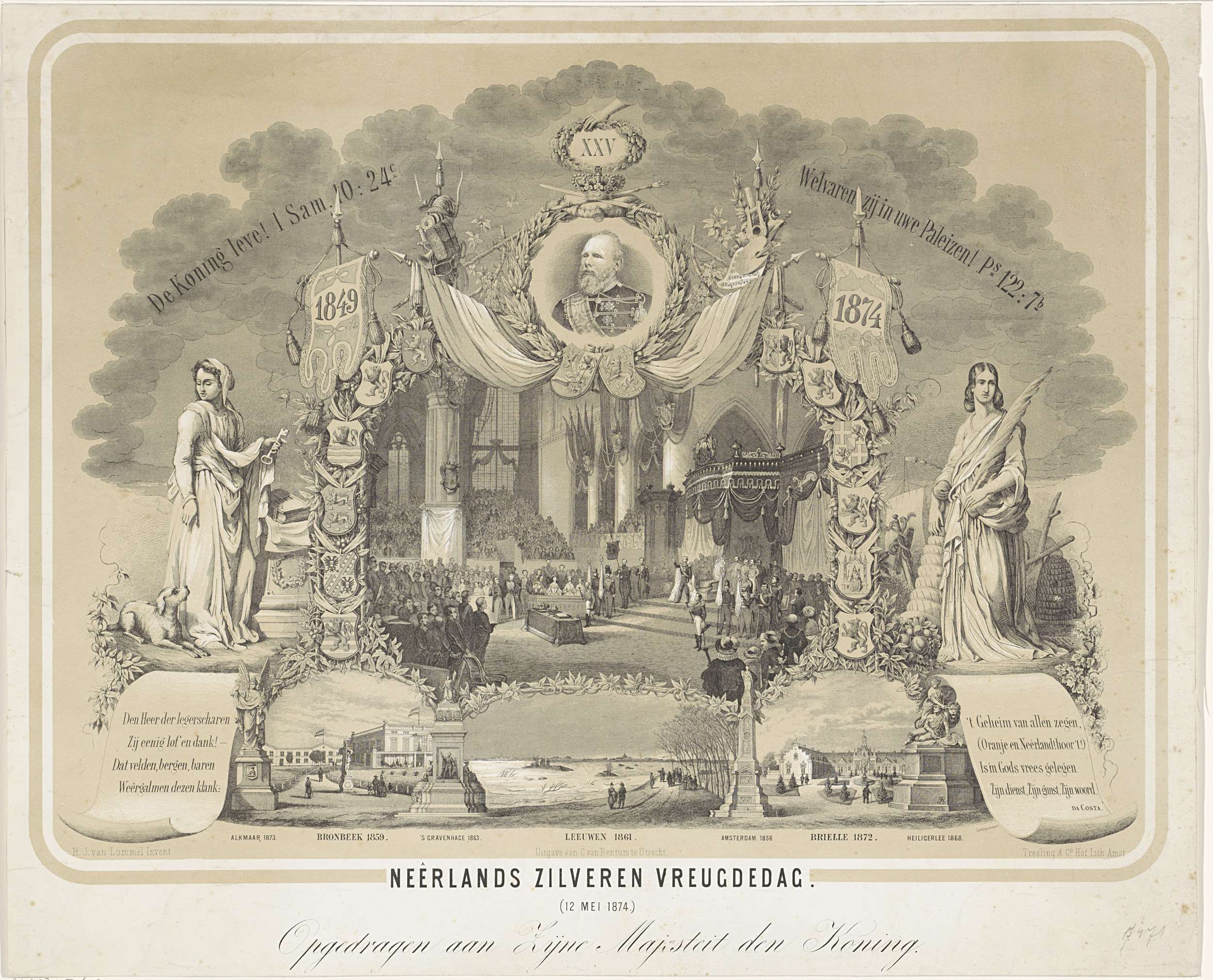 25-jarig regeringsjubileum van Willem III, 1874. Midden boven een portret van Willem III in een cirkel. In het midden een voorstelling van zijn inhuldiging in 1849. Daar omheen meerdere allegorische objecten en figuren. Daaronder drie taferelen uit zijn regering tot 1874 en in twee cartouches vier regels Nederlandse tekst. In de ondermarge drie regels Nederlandse ...