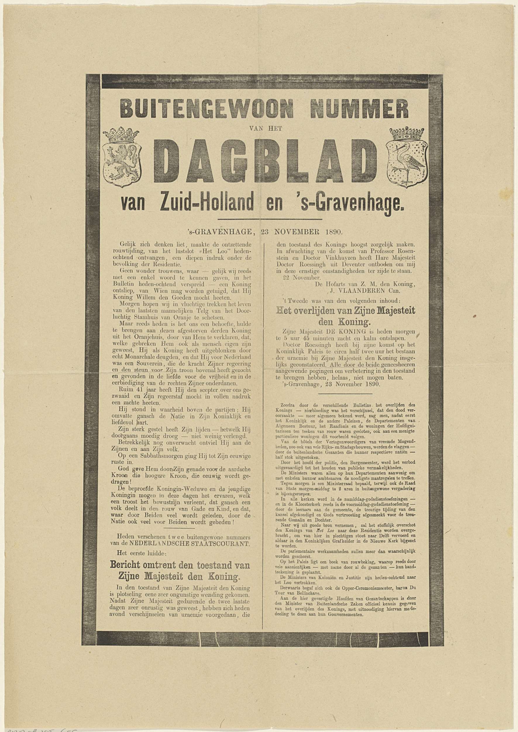 Buitengewoon nummer over het overlijden van Willem III in Paleis Noordeinde te Den Haag op 23 november 1890.