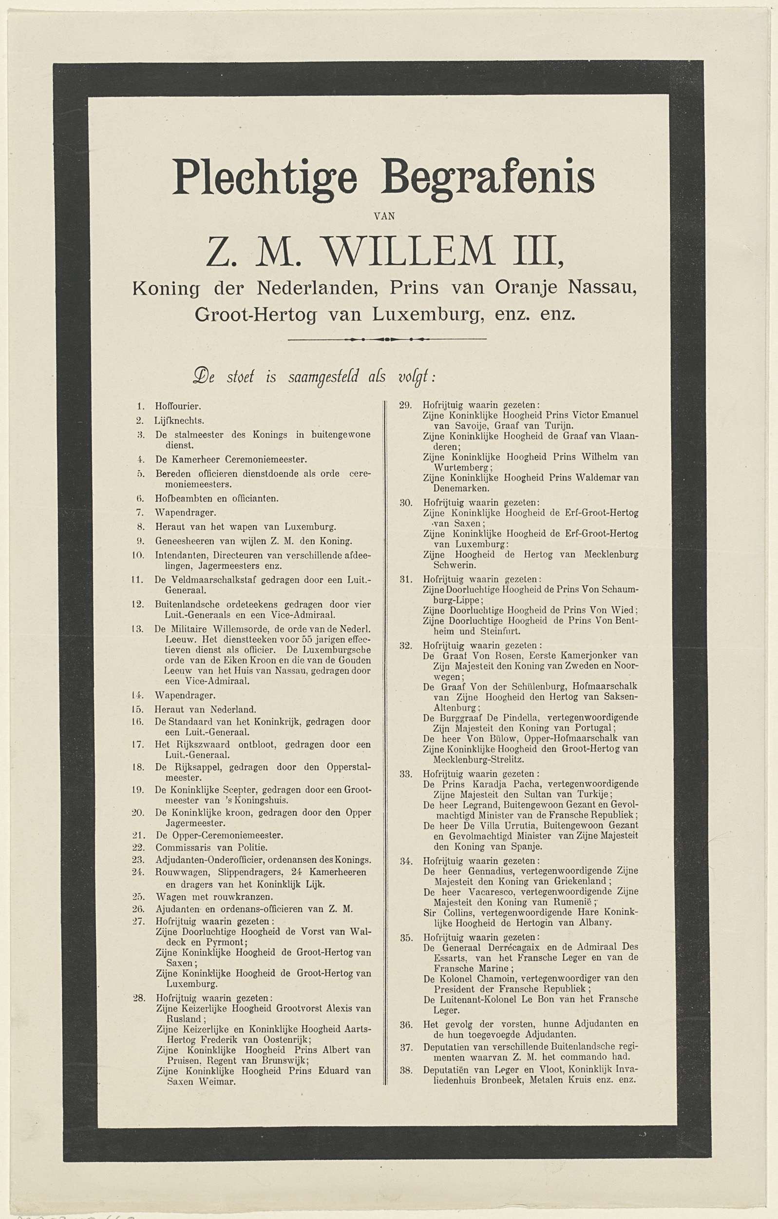 Programma van de begrafenis van Willem III, koning der Nederlanden, op 4 december 1890