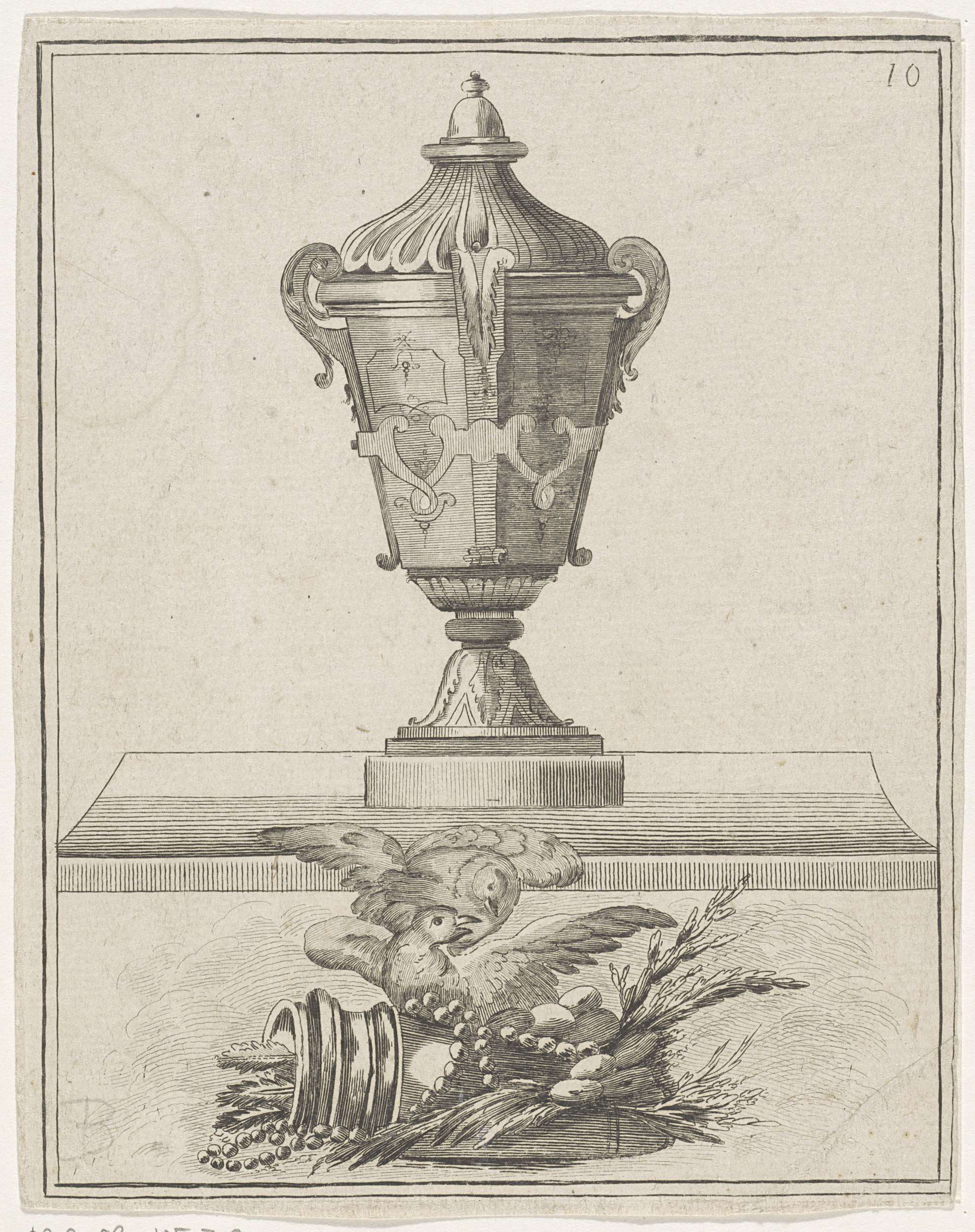Een tuinvaas met daaronder twee duiven op een liggende pot met veren en bij een ketting.