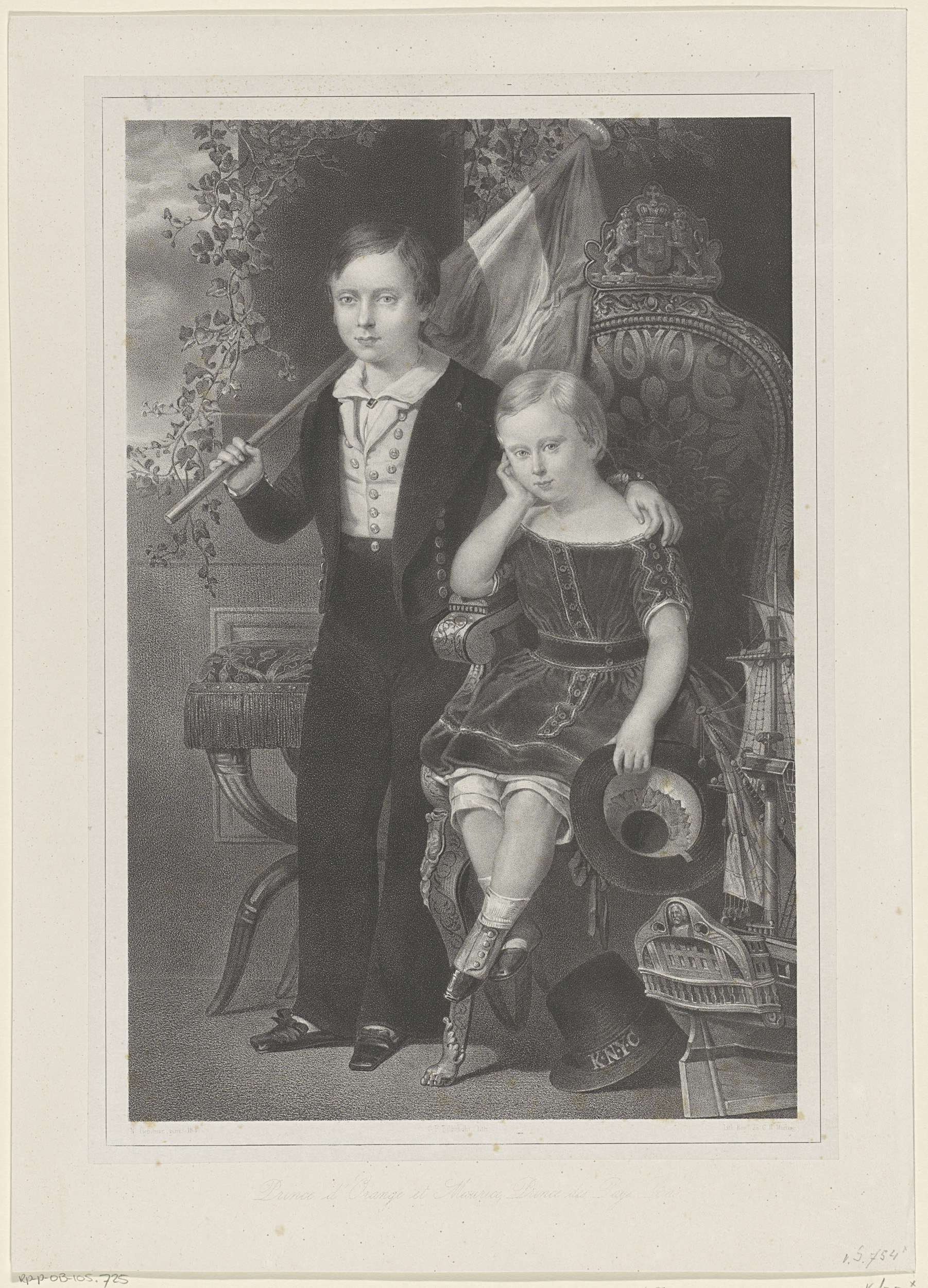Portret van Willem en Maurits. Willem heeft in zijn rechterhand een vlag. Maurits zit in een stoel met in zijn linkerhand een hoed. In de ondermarge hun namen en titels.