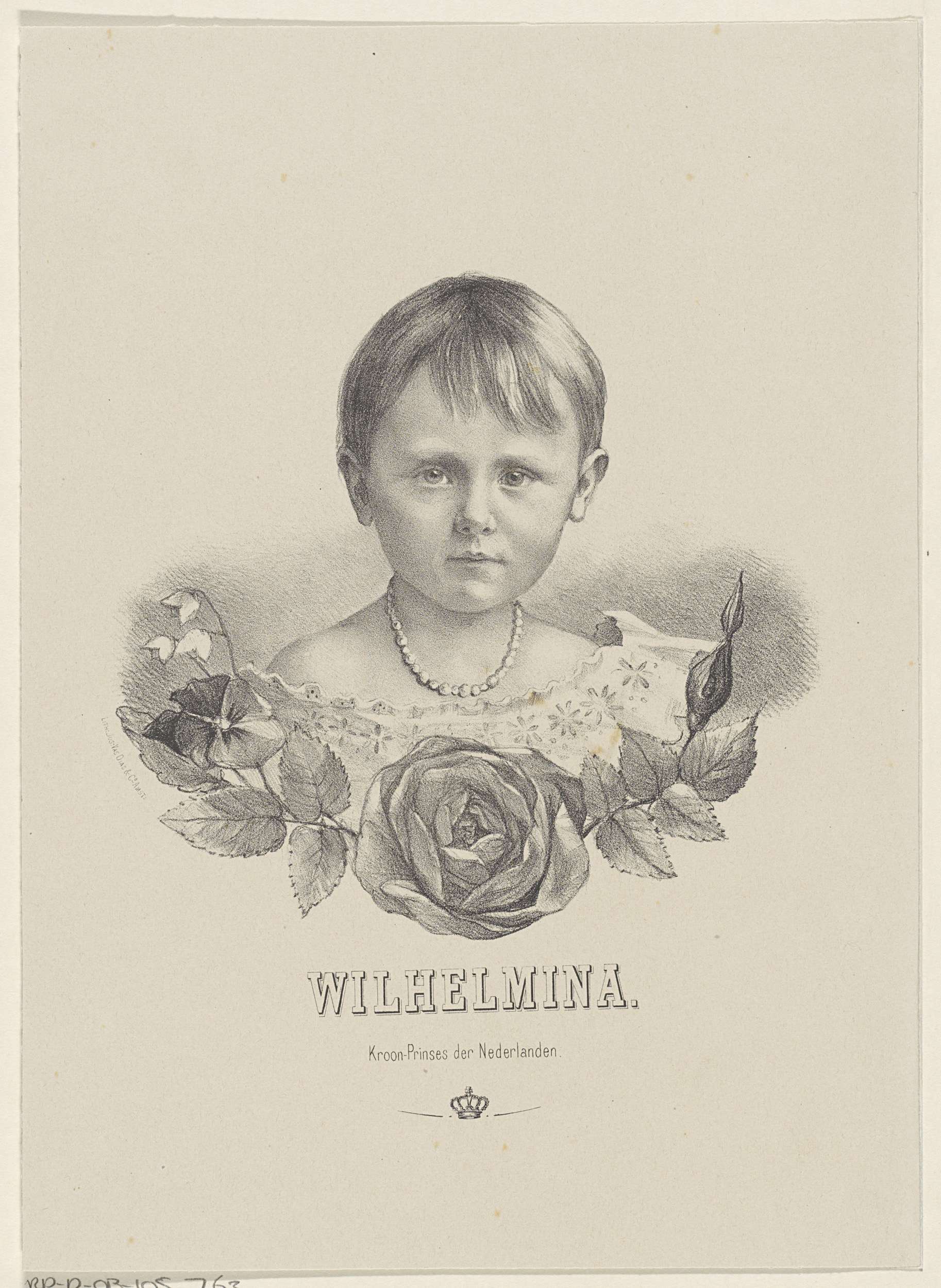 Portret van Wilhelmina. Midden onder een roos. In de ondermarge haar naam, haar titel en een kroon.