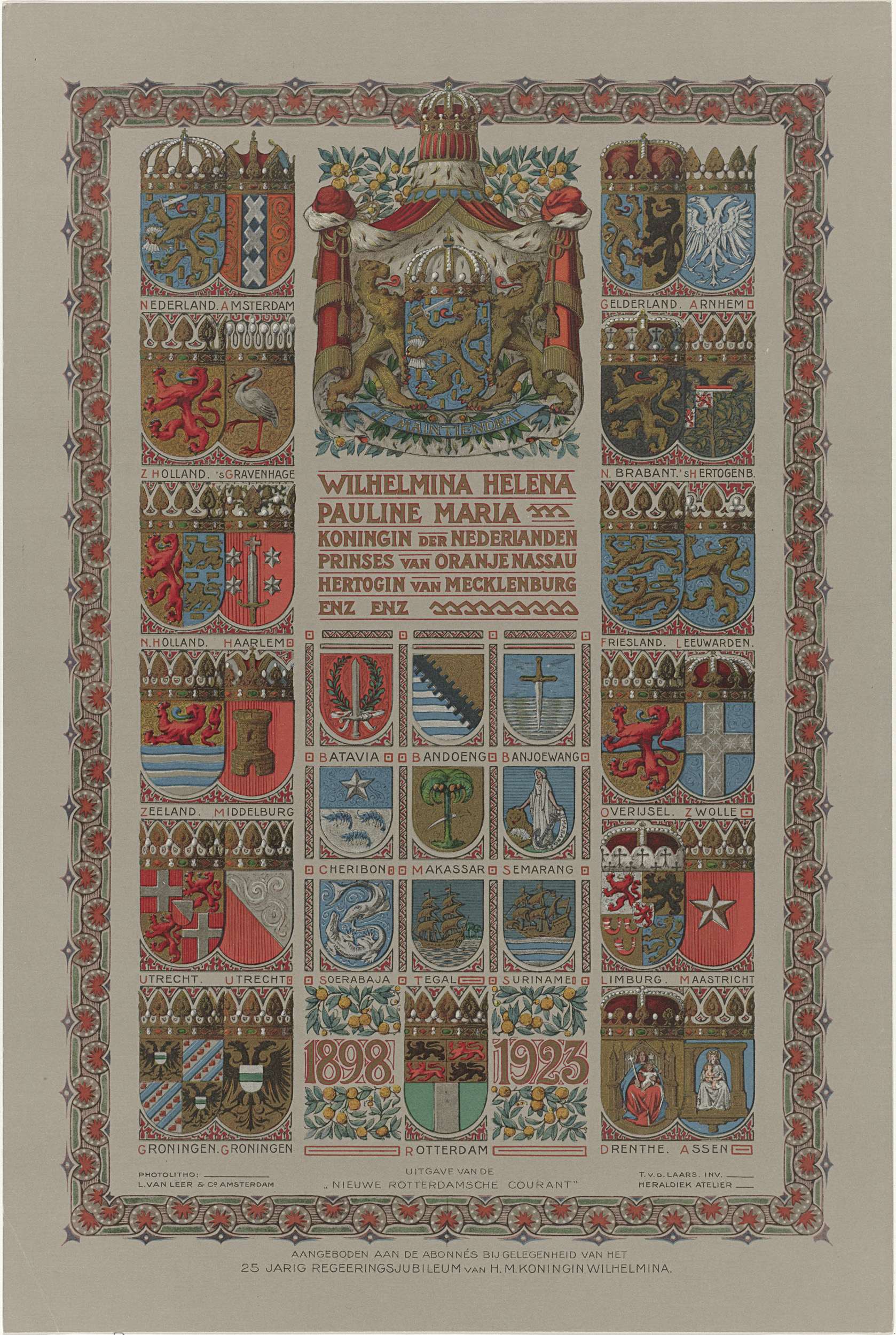 Wapens van de provinciën en hoofdsteden van het Koninkrijk der Nederlanden. Geheel in een geornamenteerde rechthoek. Vervaardigd ter gelegenheid van het 25-jarig regeringsjubileum van Wilhelmina in 1923.