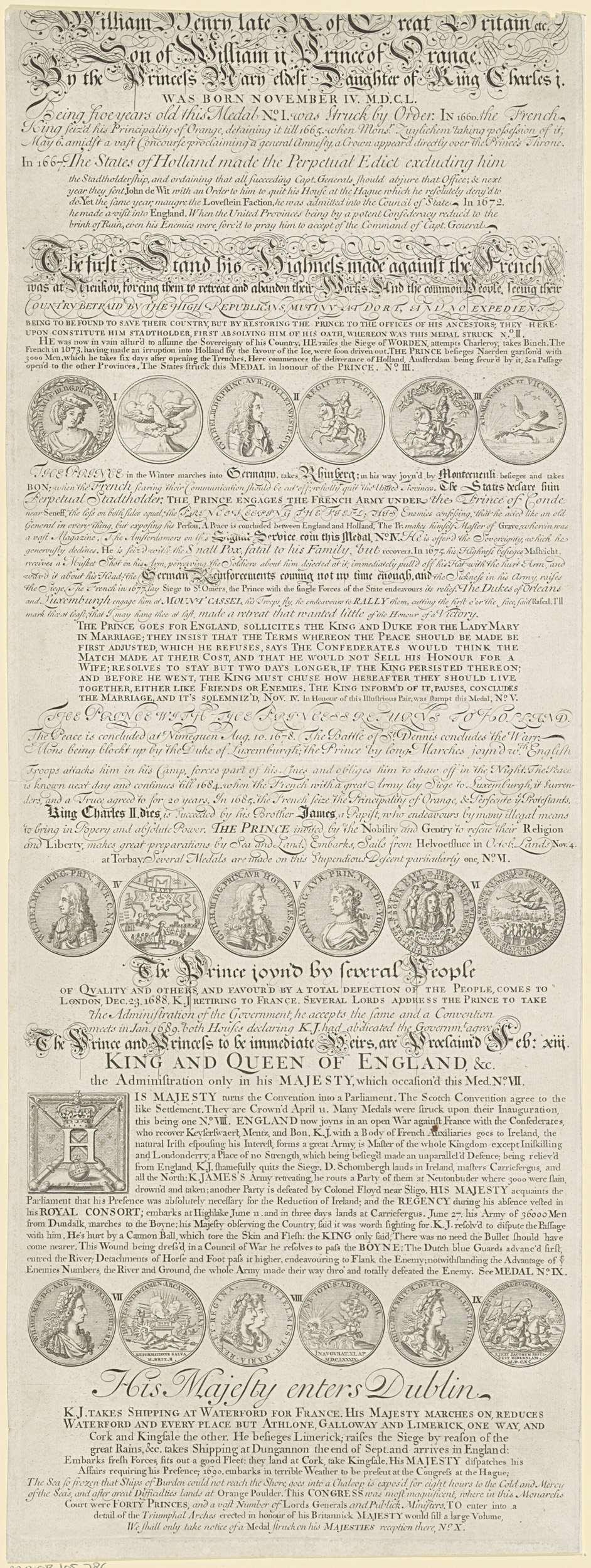 Portretten van Willem III, elk in een cirkel met randschrift. Daar omheen het levensverhaal van Willem III.