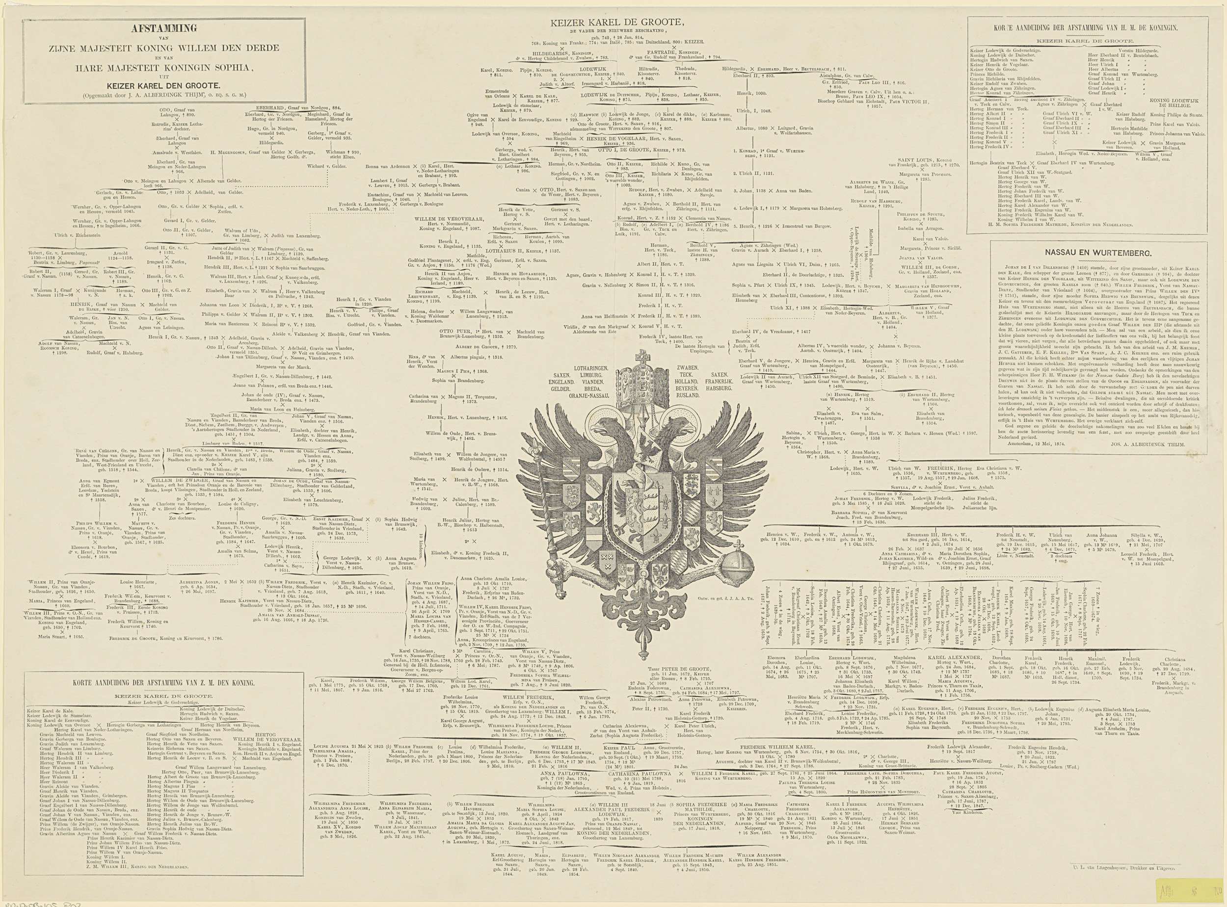 Stamboom van Willem III en Sophie, van Karel de Grote tot en met 1874. In het midden meerdere wapens en een tweekoppige adelaar met een kroon, een scepter en de rijksappel. Daar omheen namen, titels, geboortedata, trouwdata en sterfdata in boekdruk.