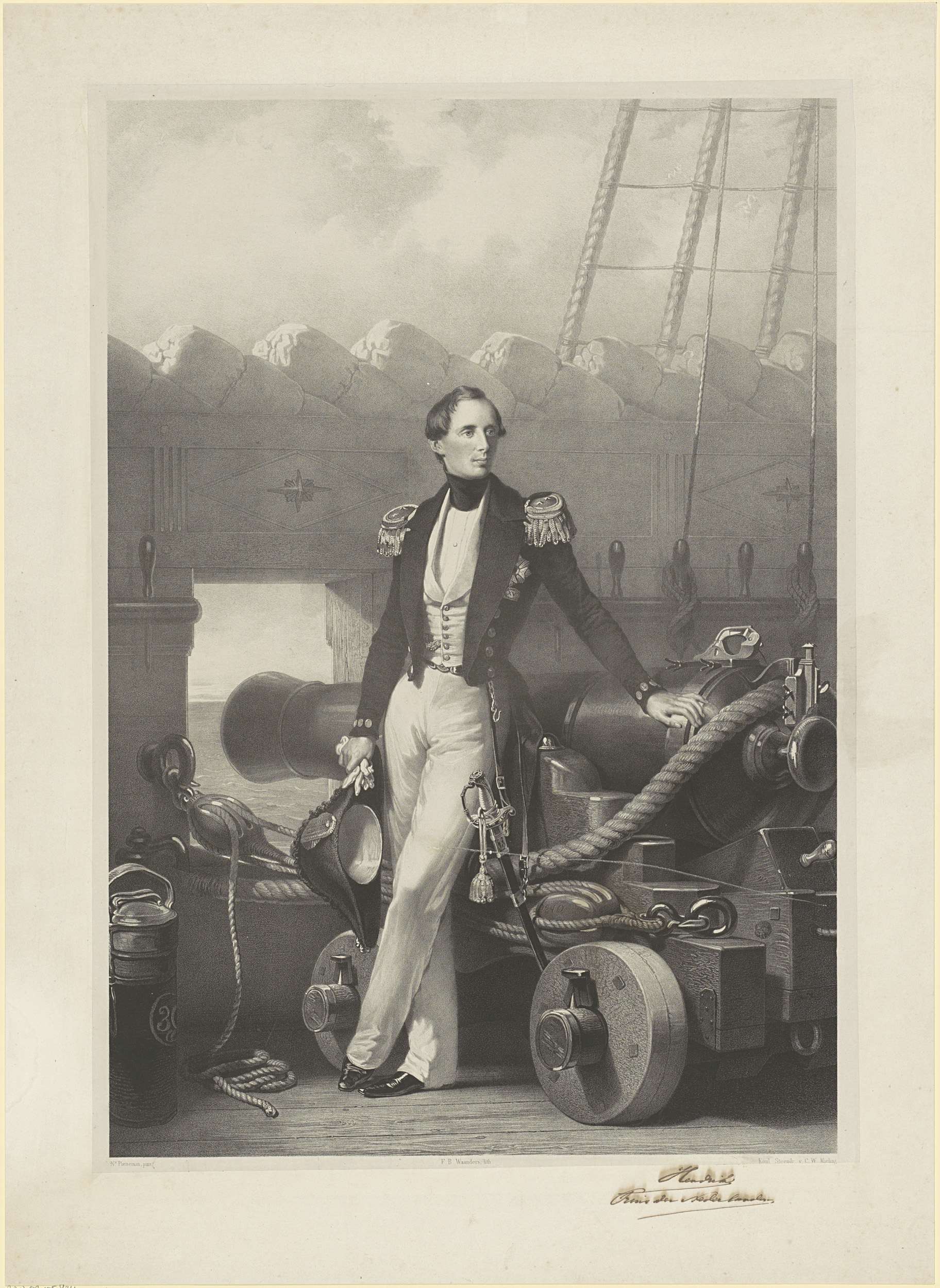 Portret van Hendrik. Hij leunt tegen een kanon op een schip.