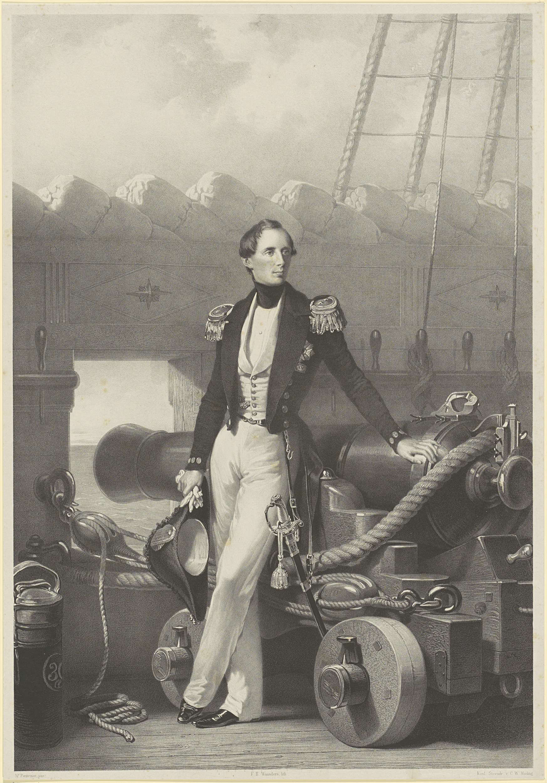 Portret van Hendrik. Hij leunt tegen een kanon op een schip.