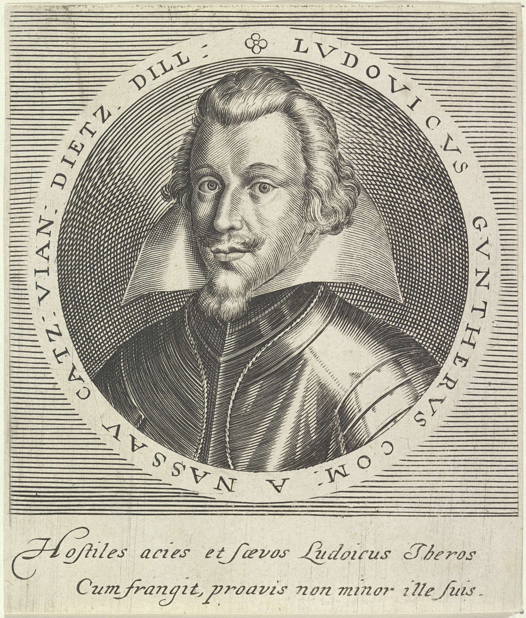 Portret van Lodewijk Gunther in een cirkel met randschrift. In de ondermarge twee regels Latijnse tekst.