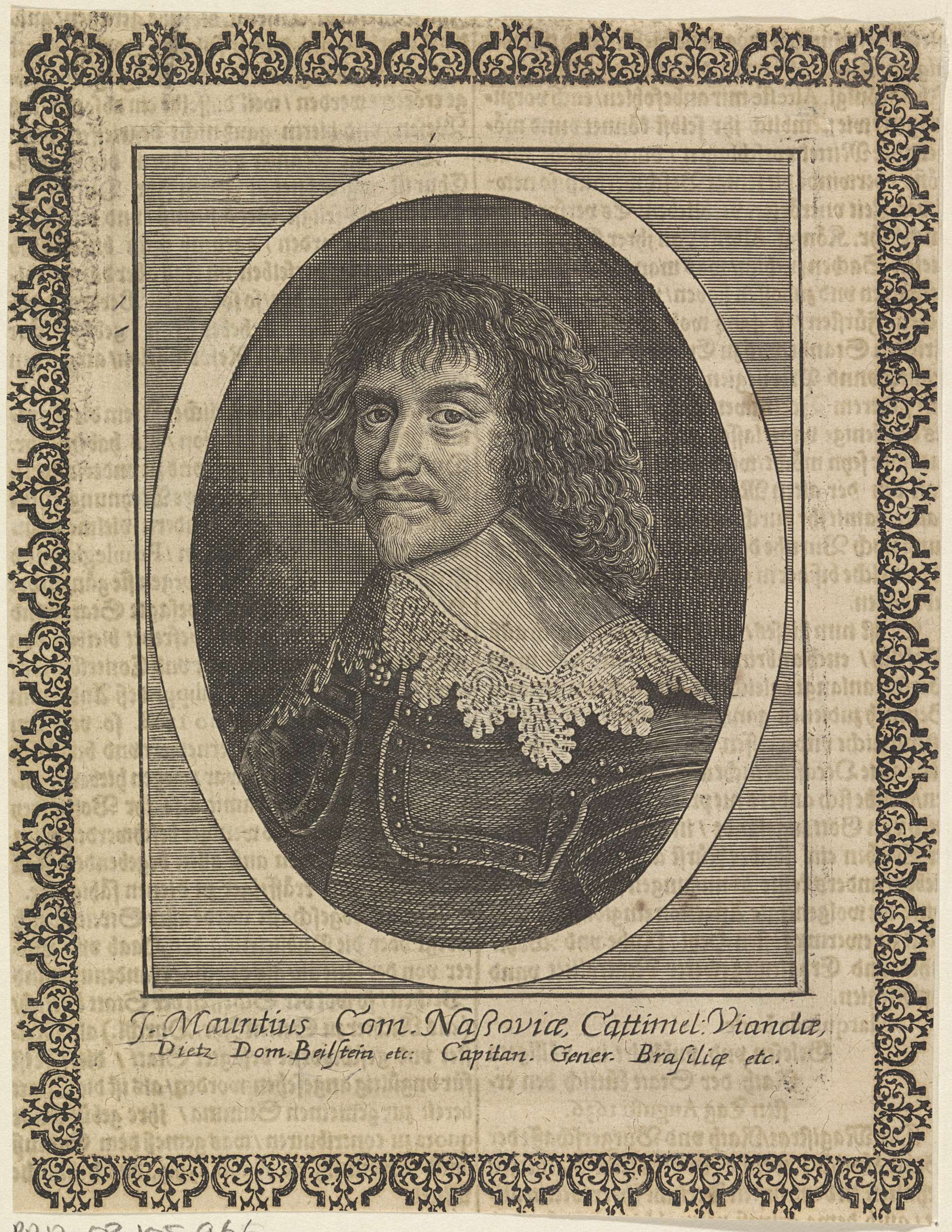 Portret van Johan Maurits in een ovaal. In de ondermarge zijn naam en titels. Geheel in een geornamenteerde rechthoek.