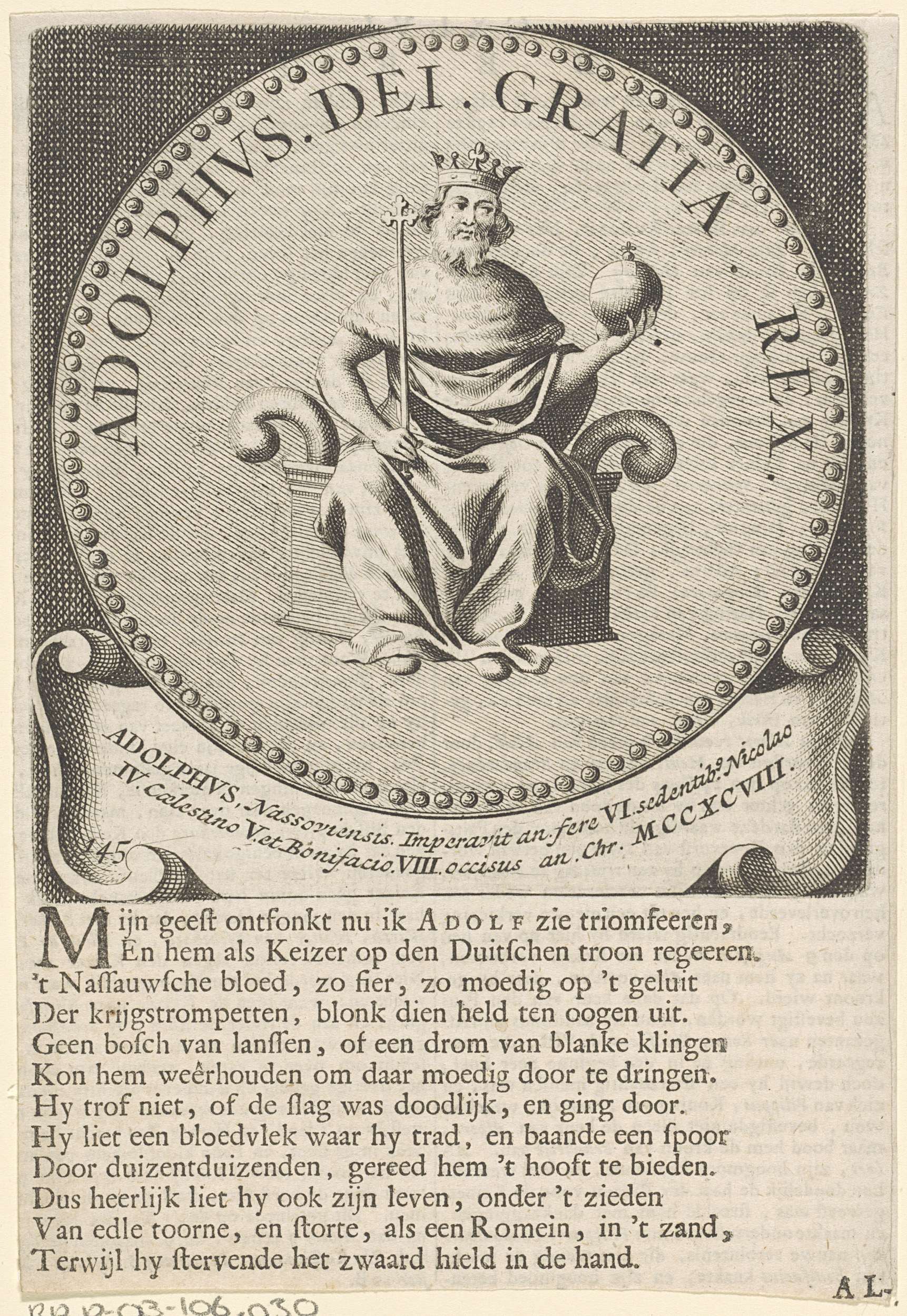Portret van Adolf in een cirkel met randschrift. In zijn rechterhand een scepter en in zijn linkerhand de rijksappel. In een cartouche twee regels Latijnse tekst. Linksonder '145'.