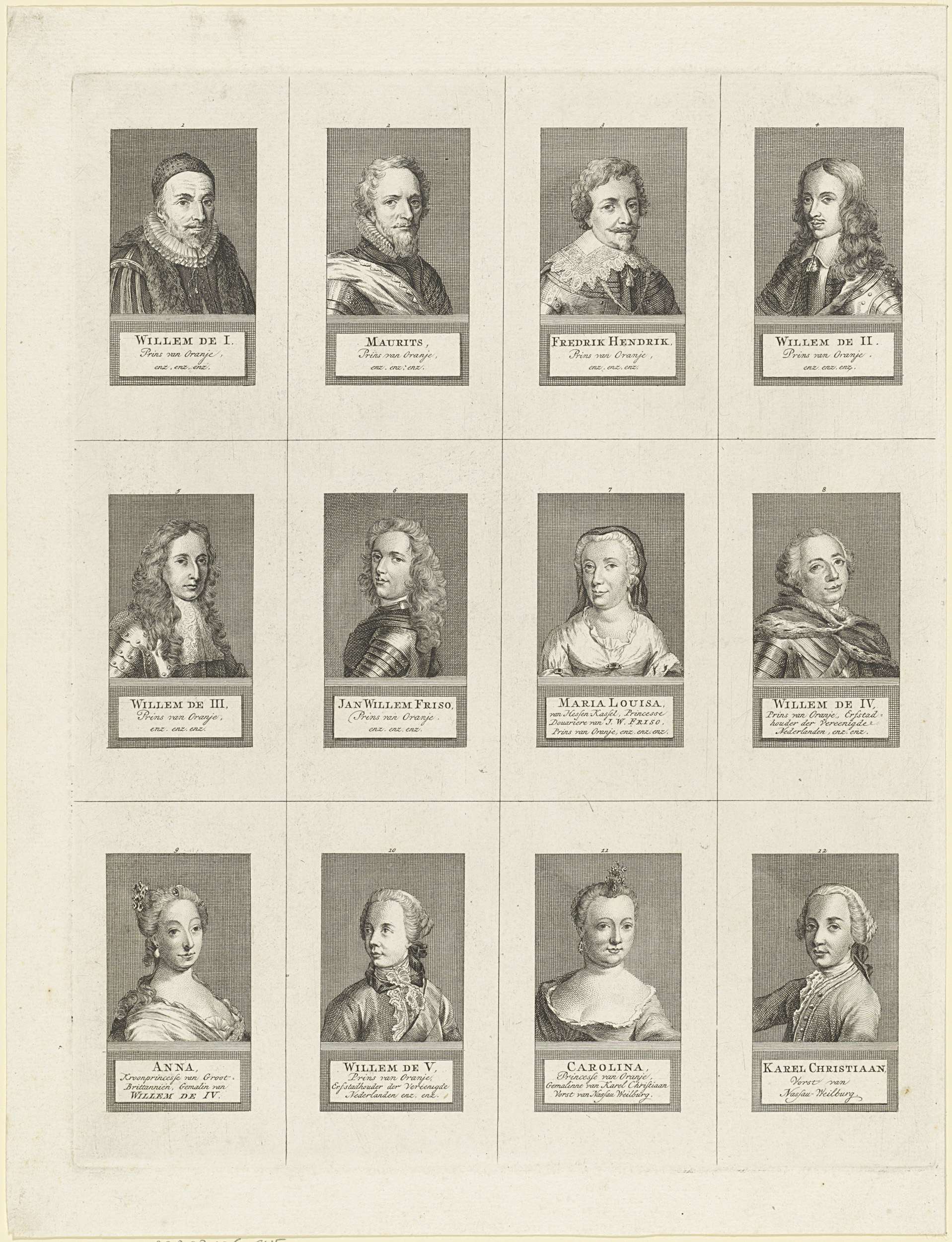 Portretten van Willem I, Maurits, Frederik Hendrik, Willem II en Willem III, prinsen van Oranje, Johan Willem Friso, prins van Oranje-Nassau, Maria Louisa van Hessen-Kassel, Willem IV, prins van Oranje-Nassau, Anna van Hannover, Willem V, prins van Oranje-Nassau, Carolina, prinses van Oranje-Nassau, en Karel Christiaan van Nassau-Weilburg
