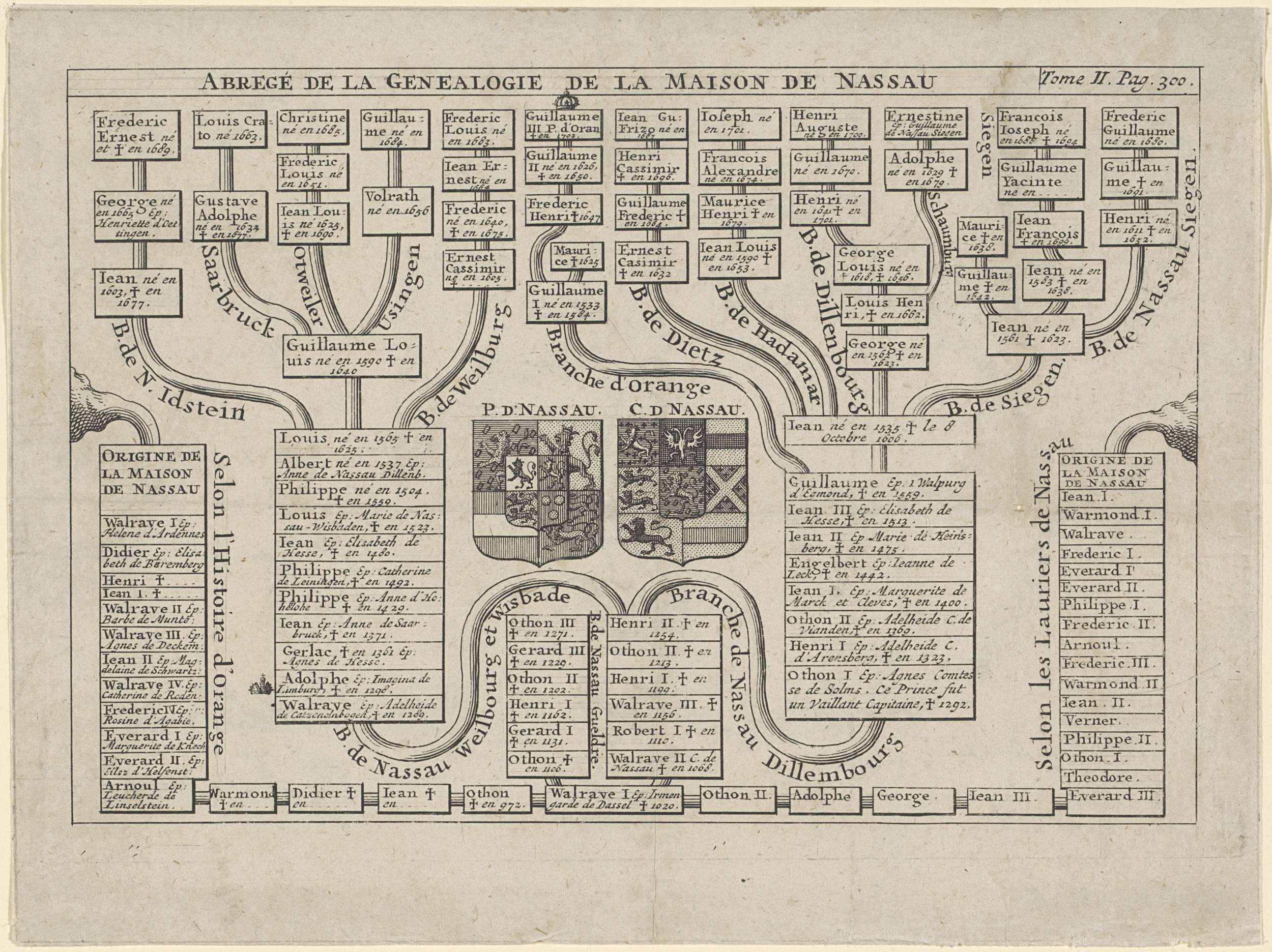 Stamboom van het Huis Nassau, van 972 tot en met 1702. In het midden twee wapens. Daar omheen in kaders namen, titels, geboortedata en sterfdata. Midden boven een regel Franse tekst. Rechtsboven 'Tome II. Pag. 300.'.