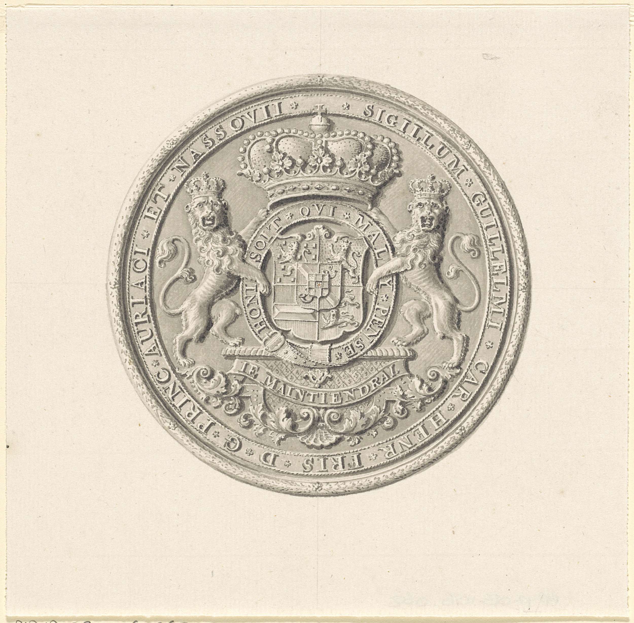 Wapen van Willem IV met een kroon en twee leeuwen, gedecoreerd met de Kousenband en het devies van de Orde van de Kousenband. Daaronder op een banderol zijn geslachtsspreuk. Geheel in een cirkel met randschrift.