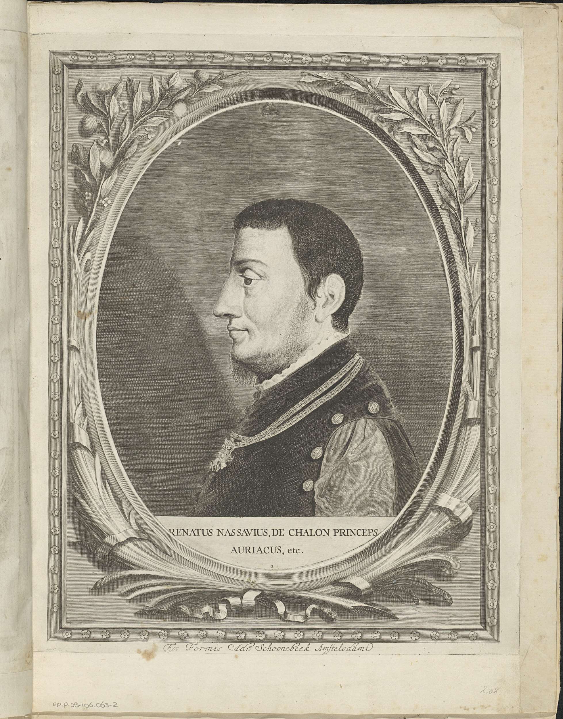 Portret van René van Châlon. In een kader zijn naam en titels. Geheel in een afzonderlijk gegraveerde ovale omlijsting met takken en linten.