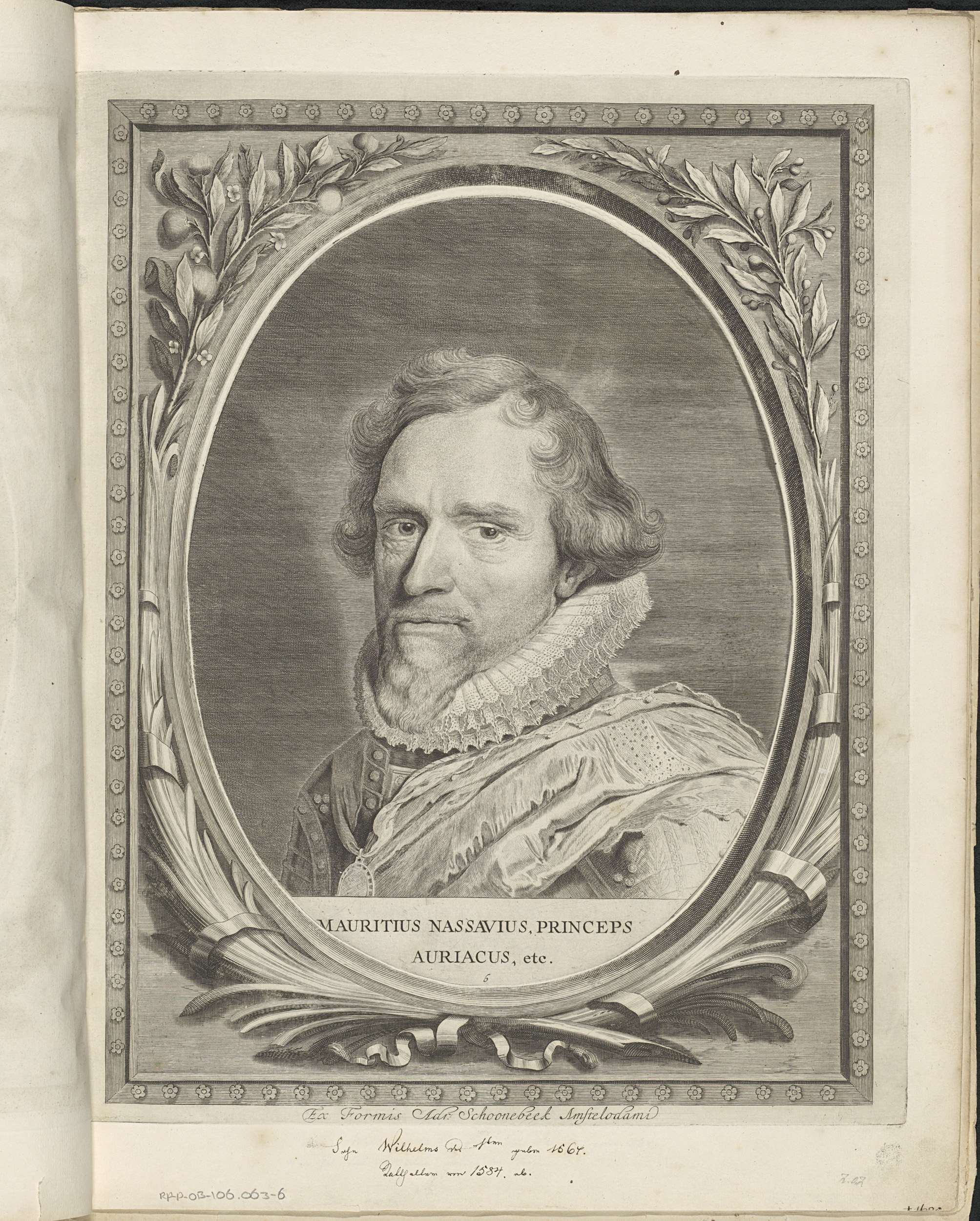 Portret van Maurits. In een kader zijn naam en titels. Geheel in een afzonderlijk gegraveerde ovale omlijsting met takken en linten.