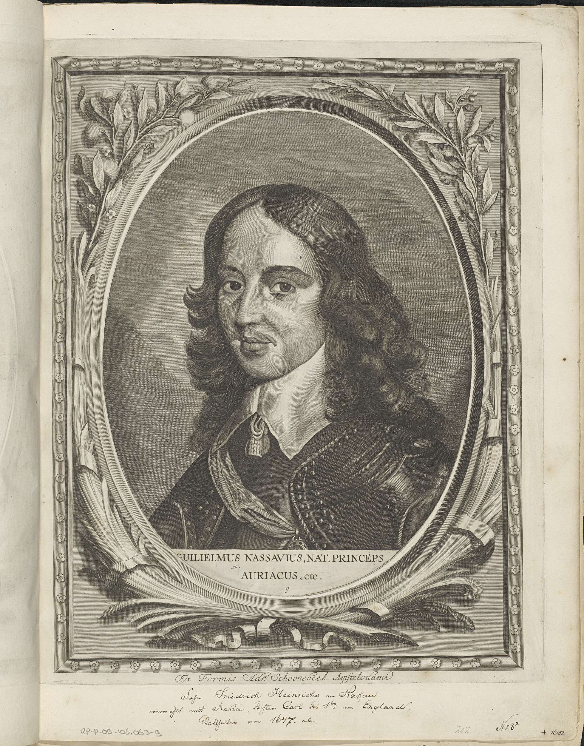 Portret van Willem II. In een kader zijn naam en titels. Geheel in een afzonderlijk gegraveerde ovale omlijsting met takken en linten.